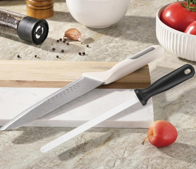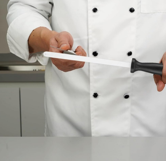 👍Hones and Realigns Cutting Edge – Unlike a knife sharpener that takes off too much of your knife’s edge metal, this ceramic honing rod is used to roll the edge back to its original position and keep it at the ideal angle for maximum sharpness. Regular use extends the life of your cutlery.
