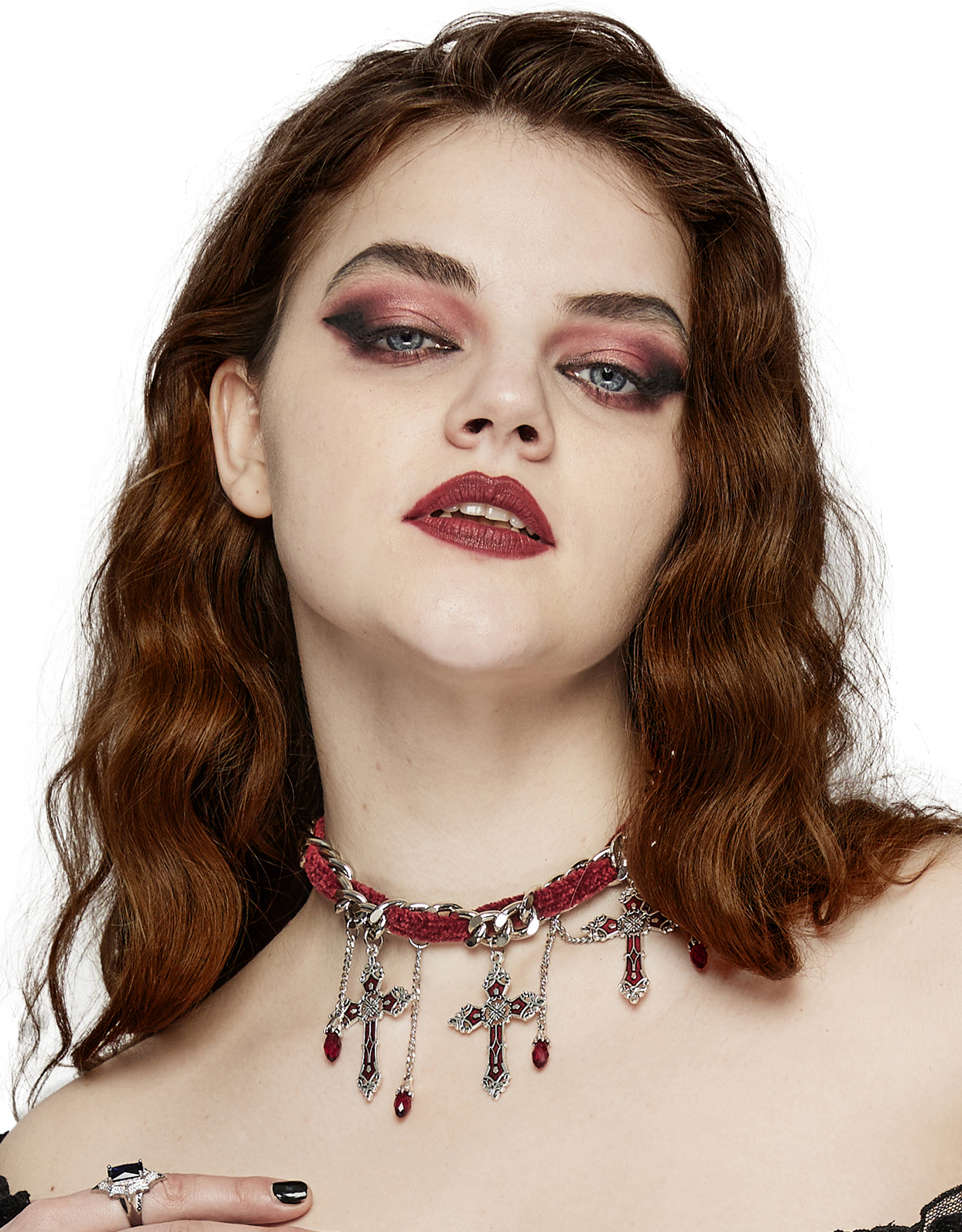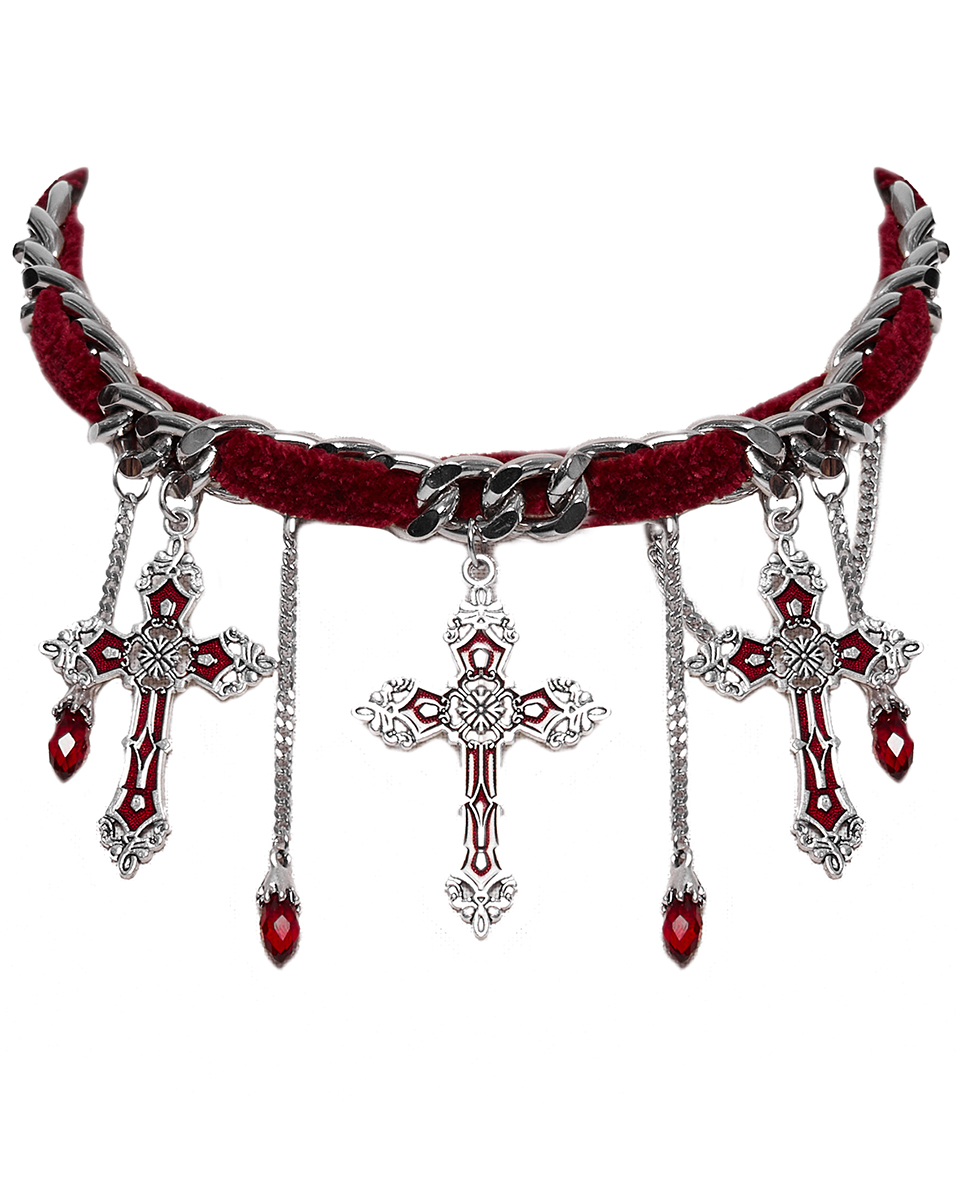 Punk Rave Gothic-Halskette mit Kruzifix und Juwelen für Damen, roter Samt