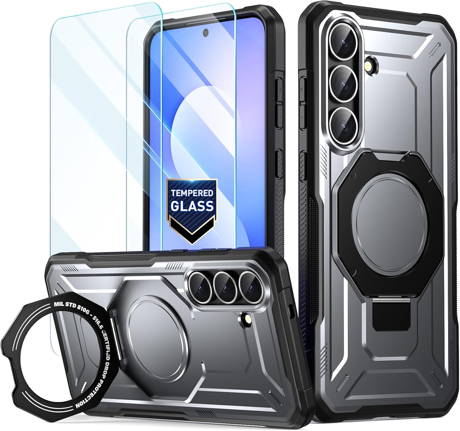 - [MagSafe Ring Stand] - The S25 FE Case includes a hidden magnetic Aluminum Alloy Ring stand with the strongest N52 magnet array, boasting a 15N ultra-strong magnetic force up to 1350g. It is compatible with MagSafe wireless chargers, magnetic car mounts, magnetic wireless chargers, and wireless chargers.