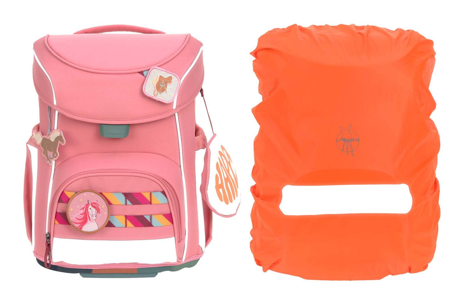 - Schulranzen mit Etikett, Patches, Anhänger, Brustgurt, Schlüsselfinder, Beckenflosse mit Hüftgurt, Schlüsselring