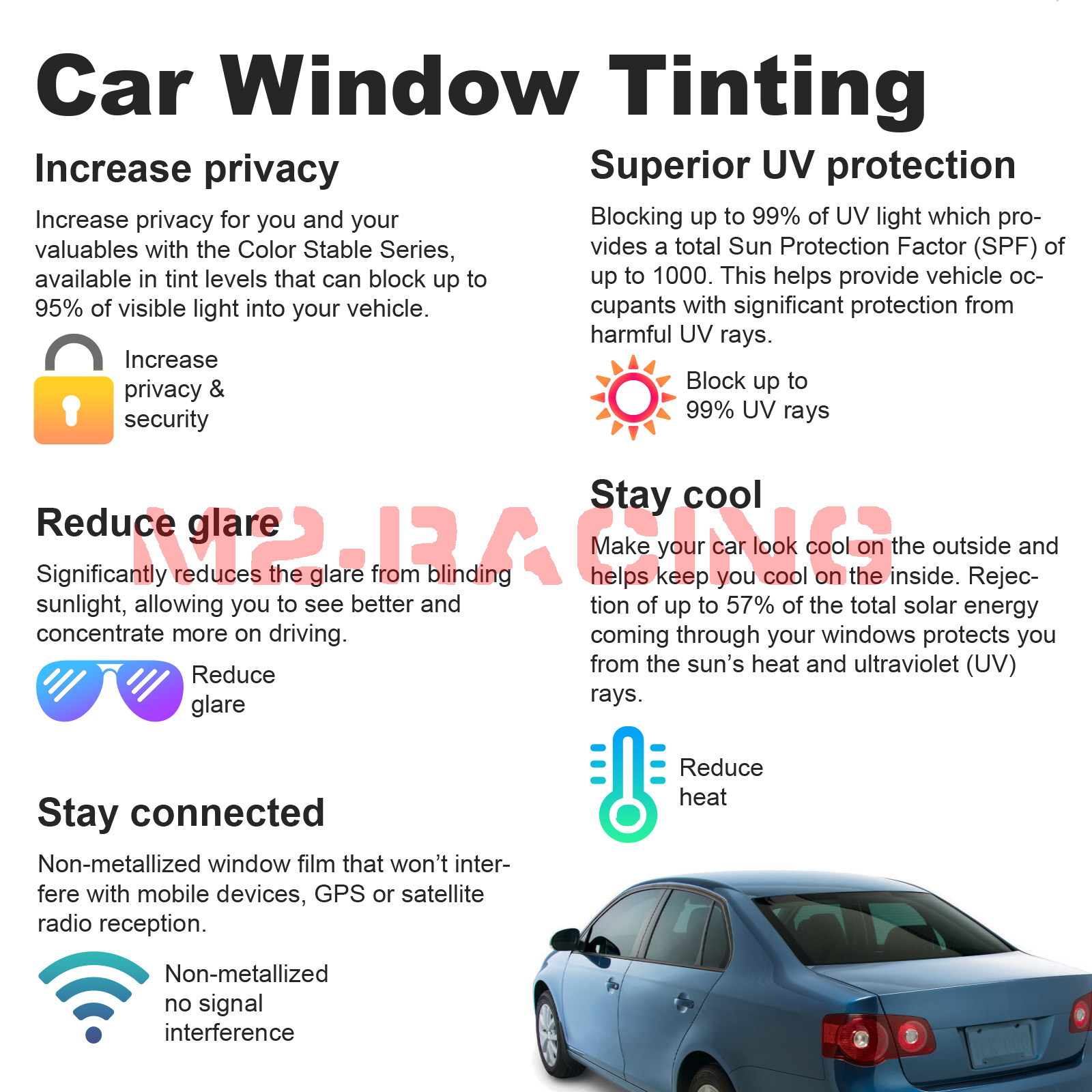 Our Professional Window Tinting Films allows for maximum heat rejection without a metallized film, which can interfere with radio and satellite signals. It also gives our films a stylish look with outstanding color stability, and provides high heat rejection with no signal interference! And is non-metallized to ensure no signal interference. Our professional tint film rejects up to 50% of the heat coming through your windows