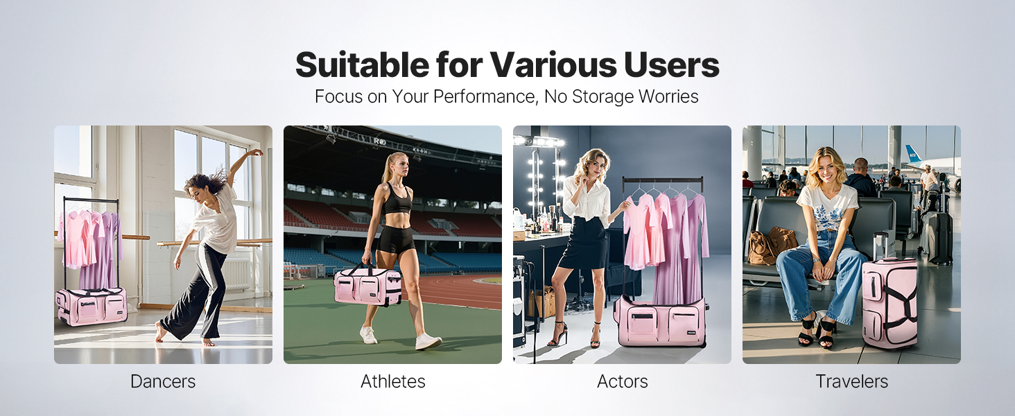 - Your Private Space Backstage: This dance bag comes with a privacy curtain, creating a personal space for quick outfit changes and rest backstage. It also features a USB port, allowing you to store your power bank inside the bag and charge on the go, anytime and anywhere