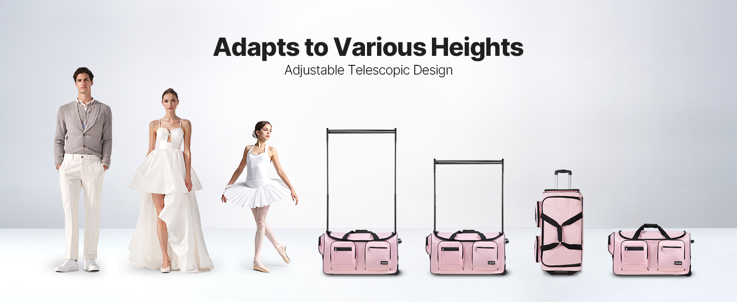 - Anti-Tilt Garment Rack: A dance bag with garment rack that adjusts to two heights—35.43 inch / 90 cm and 57.09 inch / 145 cm—ideal for users of various heights. Hand-carry or roll it with ease for effortless competition days