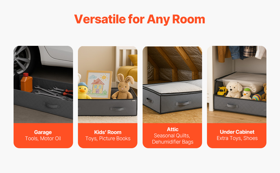 Our under bed storage serves households of all sizes and frequent movers. It optimizes space utilization by efficiently storing items, offering discreet organization with dustproof, anti-damp, high-load capacity, and easy mobility, delivering a modular storage solution tailored for compact spaces.