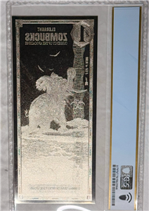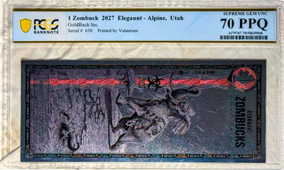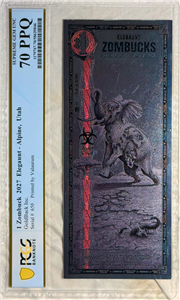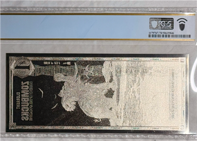 US PAPER CURRENCY is an Authorized Goldback Distributor. The Zombucks "ELEGAUNT" silver note, dubbed the "Currency of the Apocalypse," envisions a dystopian future where precious metals replace traditional money. Made from 1/1000th troy ounce of pure silver, it symbolizes value in a chaotic world. The zombified ELEGAUNT design reflects the collapse of normalcy, turning even nature's icons into ominous figures. This note appeals to collectors and survivalists, reminding us of silver's enduring worth in uncertain times. It is graded PCGS SUPREME GEM UNC 70 PPQ and is 1/1000TH TROY OZ of PURE SILVER.