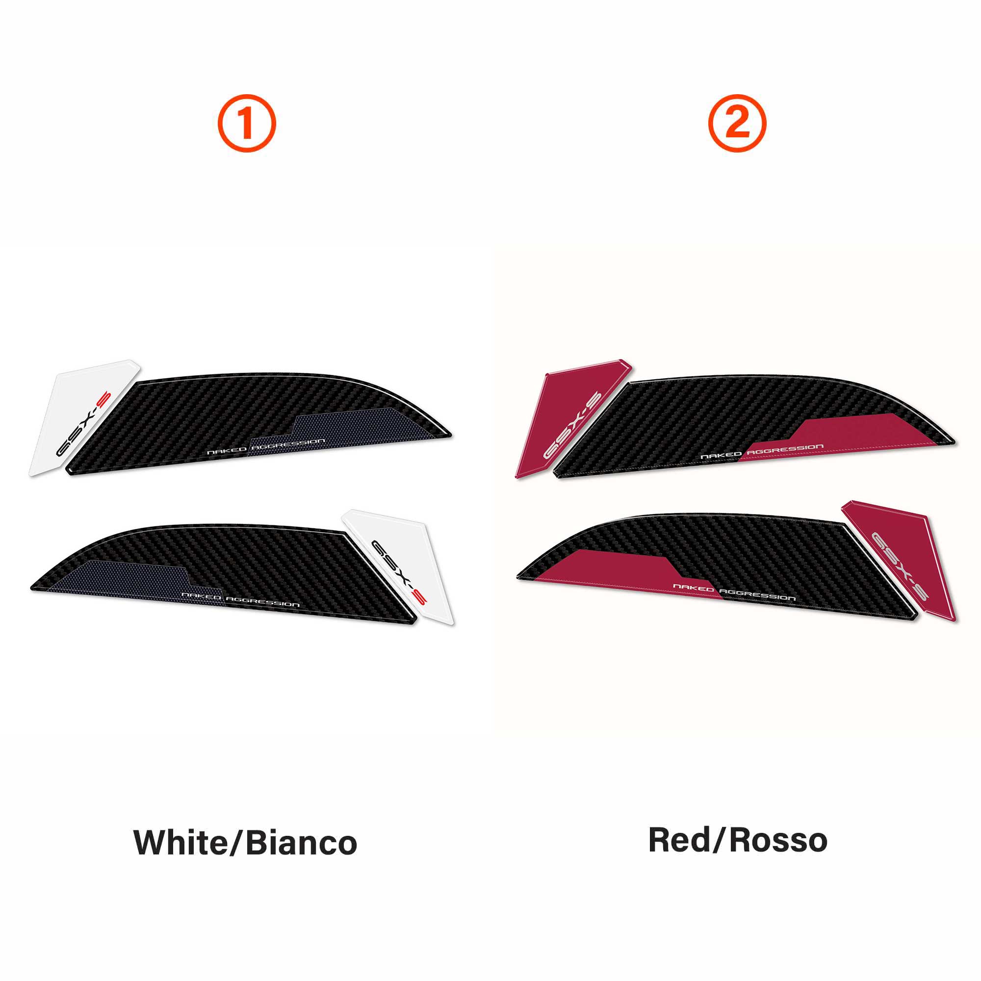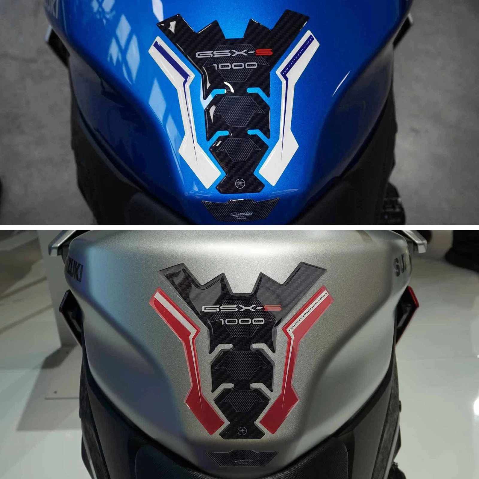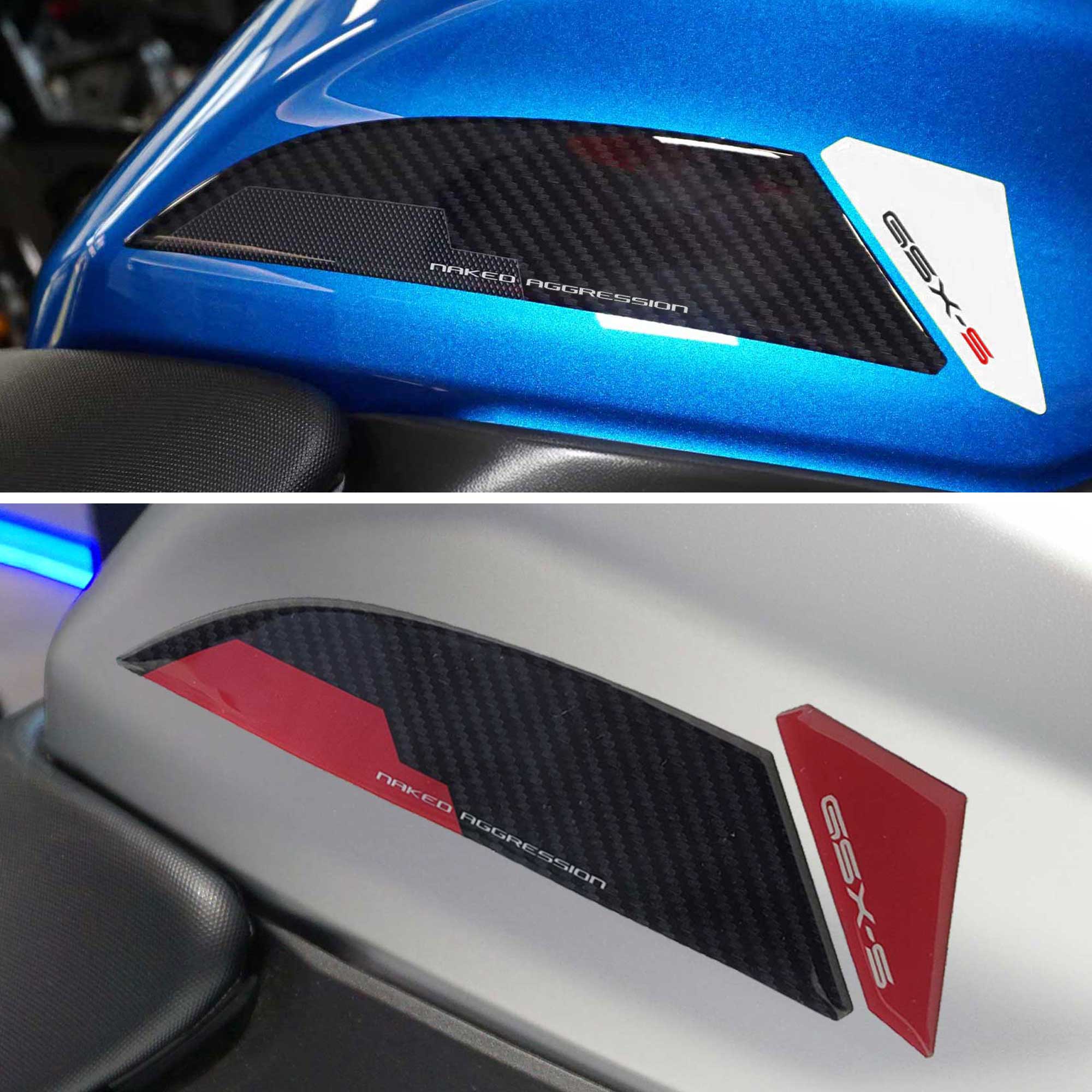 Adhesive protections resin by side area tank SUZUKI GSX-S 1000 2024 motorcycle. Two 3D gel resin stickers Exclusive - Labelbike®. Lateral stickers for tank Made in Italy made in Resin with 3D effect. Graphics for the coloring 2024 carbon look and white or carbon look and red with writings GSX-S Naked Aggression. They decorate and repair from impacts and scratches the tank of yours Suzuki GSXS 1000 2024, resist washing, weather and UV rays