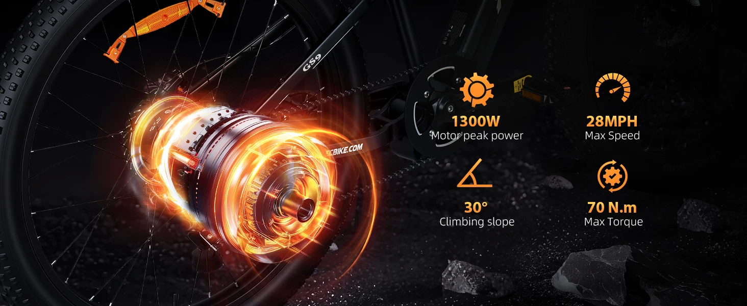 Powered by a 1300W peak rear hub motor and 48V lithium-ion battery, this e-bike boasts a maximum speed of 35 mph and an impressive maximum range of up to 60 miles, letting you explore further without worrying about running out of power. With 70N.M of max torque, it easily handles steep inclines, while the 8-speed derailleur gears (controlled by a convenient grip shifter) offer smooth and precise gear changes for every riding scenario.