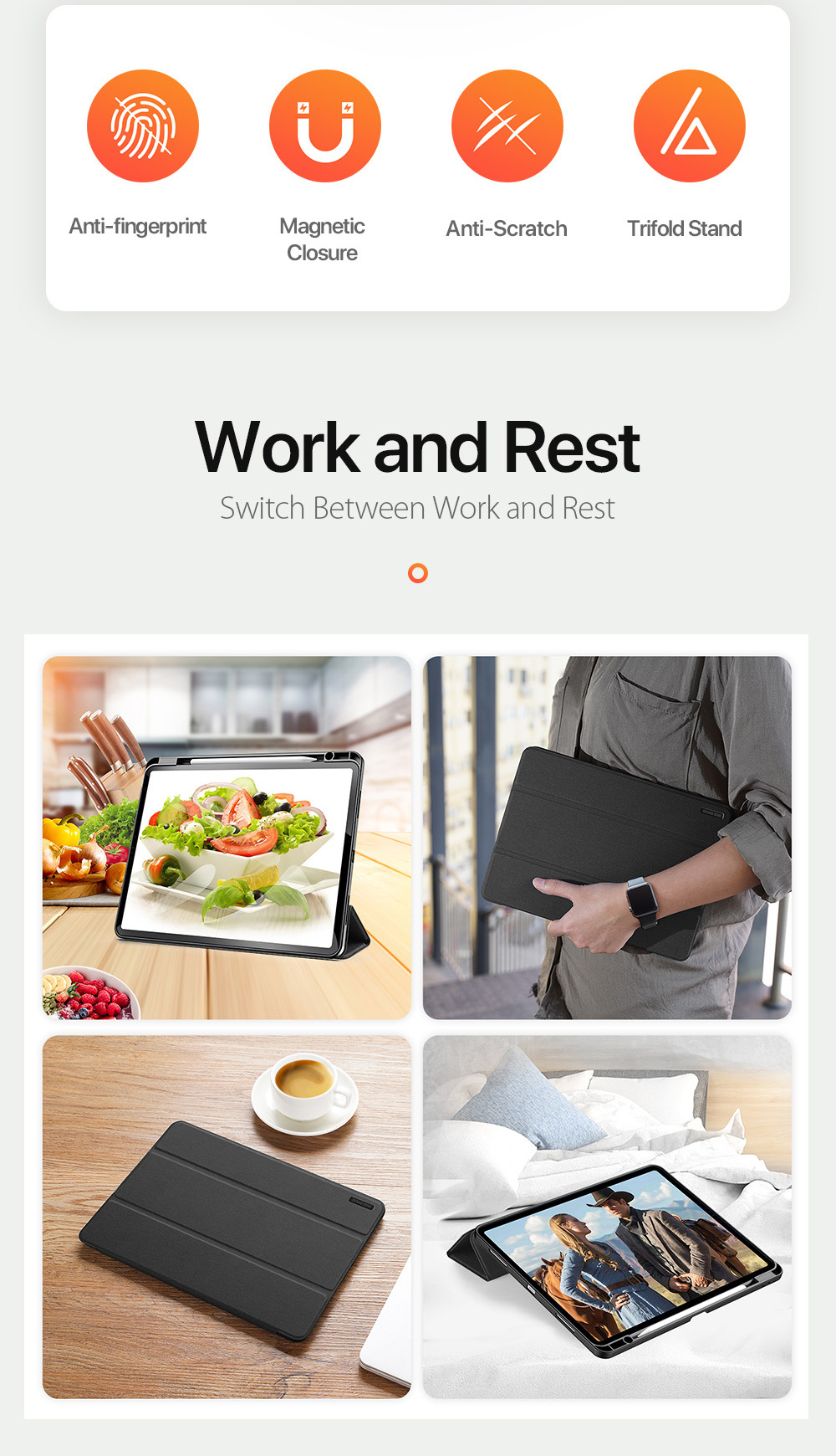 Comes with wake/sleep function, open the case, the tablet wakes up; close the case, the tablet sleeps.