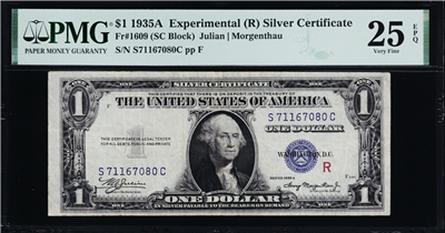 USPC FR#1609 $1 1935A EXPERIMENTAL (R) SILVER CERT GRADED PMG 25 VF EPQ. THIS IS A VERY RARE AND SOUGHT AFTER NOTE BY COLLECTORS.