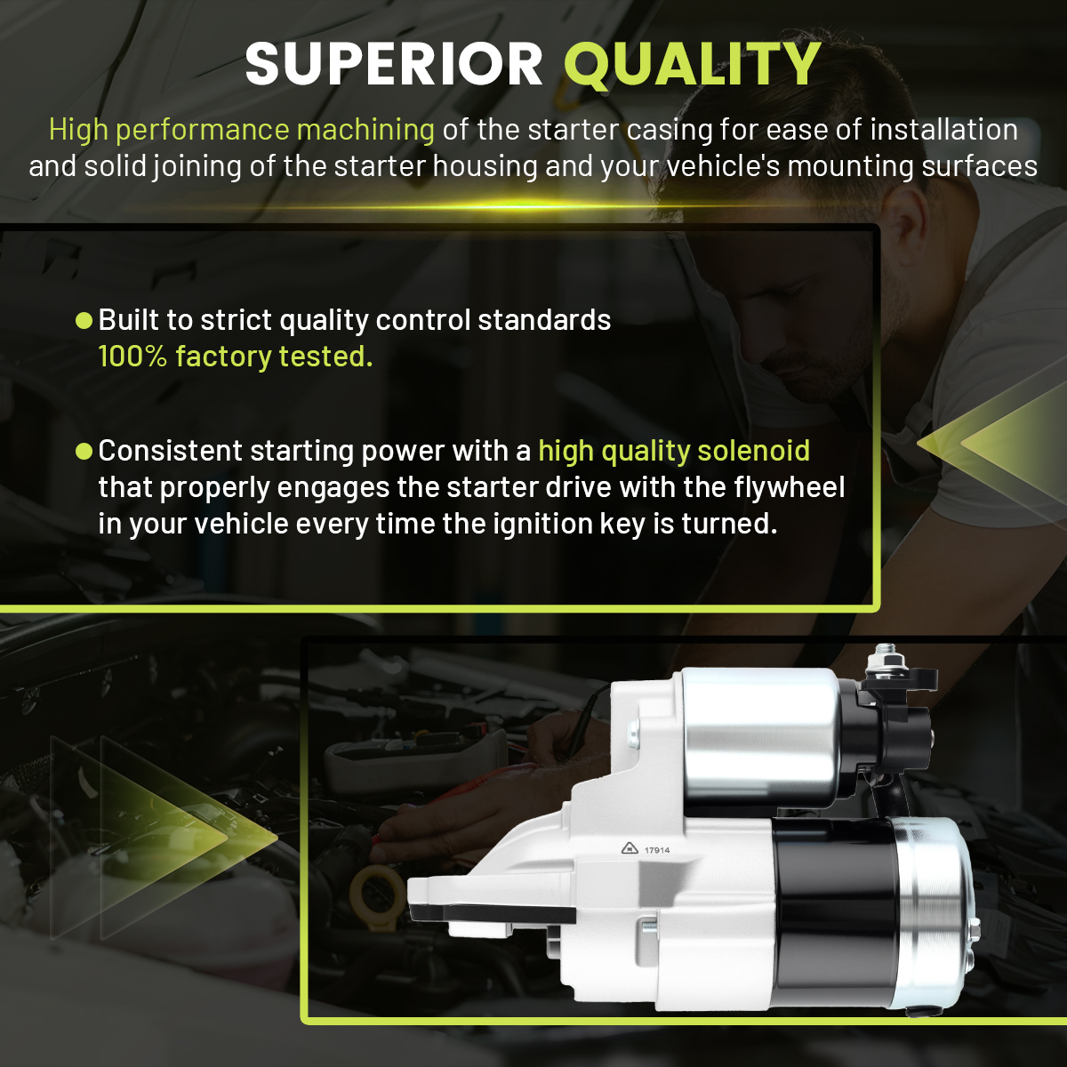 Consistent starting power with a high quality solenoid that properly engages the starter drive with the flywheel in your vehicle every time the ignition key is turned.