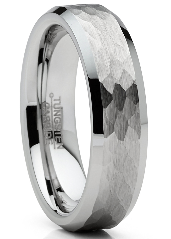 Mens Tungsten Ring Hammered Wedding Band Silvertone Comfort-fit 6MM 8MM