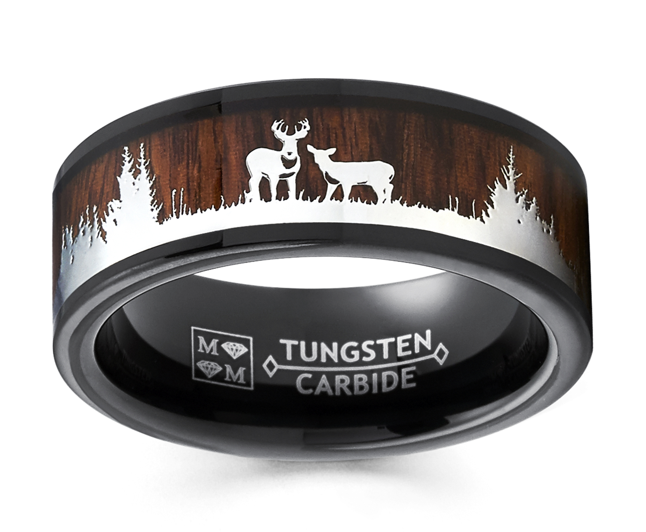 Men's Black Tungsten Hunting Ring Wedding Band Wood Deer Nature 8MM