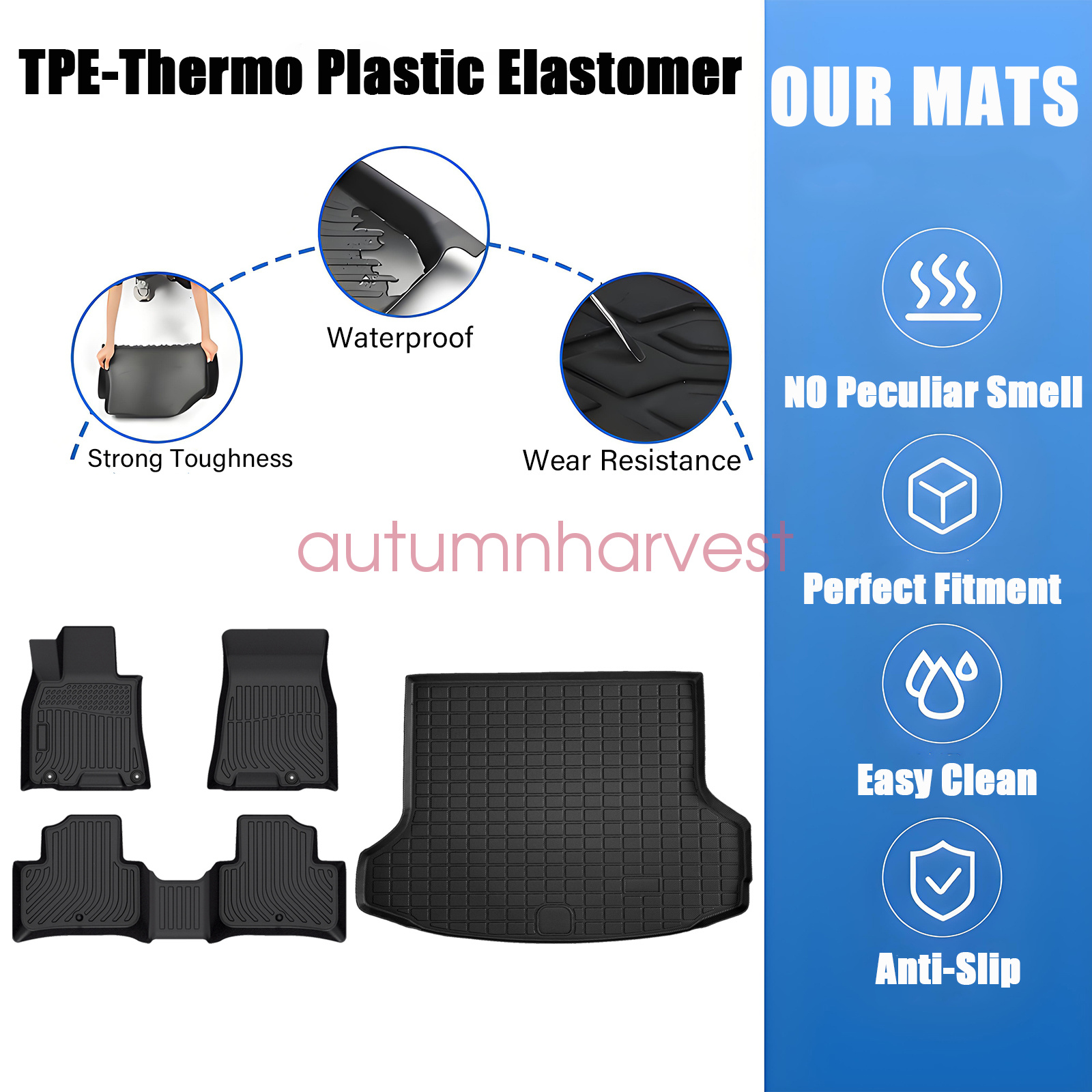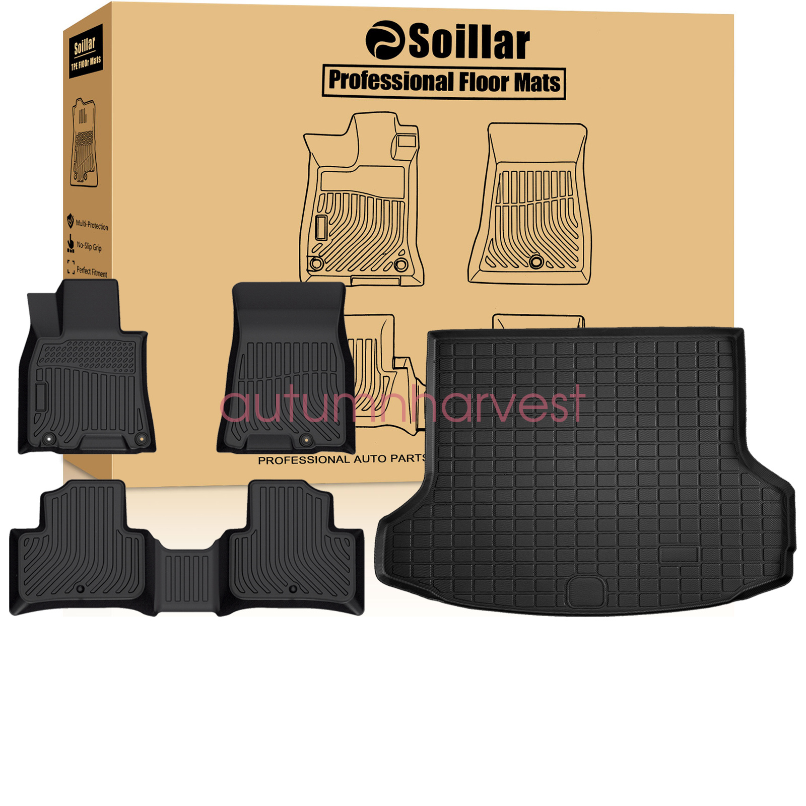 Soillar floor mats use elastic TPE (Thermoplastic Elastomer), No foul odor is produced even at high temperatures. soft touch and exquisite finish. This floor mats are skid-proof and recyclable.