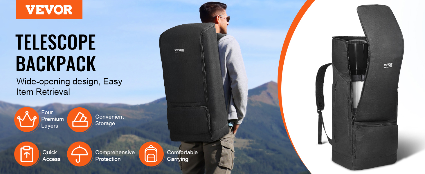 Our telescope backpack features a wide opening for quick access. Made from rugged, waterproof, and dirtproof materials, telescope storage bag offers comprehensive protection for telescope. The soft interior of telescope bag ensures effective shock absorption, keeping your telescope secure.