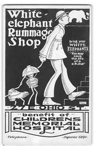 RPPC White Elephant Rummage Shop Advertising 27 E Ohio Street Chicago, Illinois Grover C. Martin Children's Memorial Hospital Poster-Style Art Artist-Signed 1920s 1910s Antique Vintage Rare Postcard. The telephone number "Superior 6846" near the bottom edge of the postcard was used for Chicago during the 1920s.