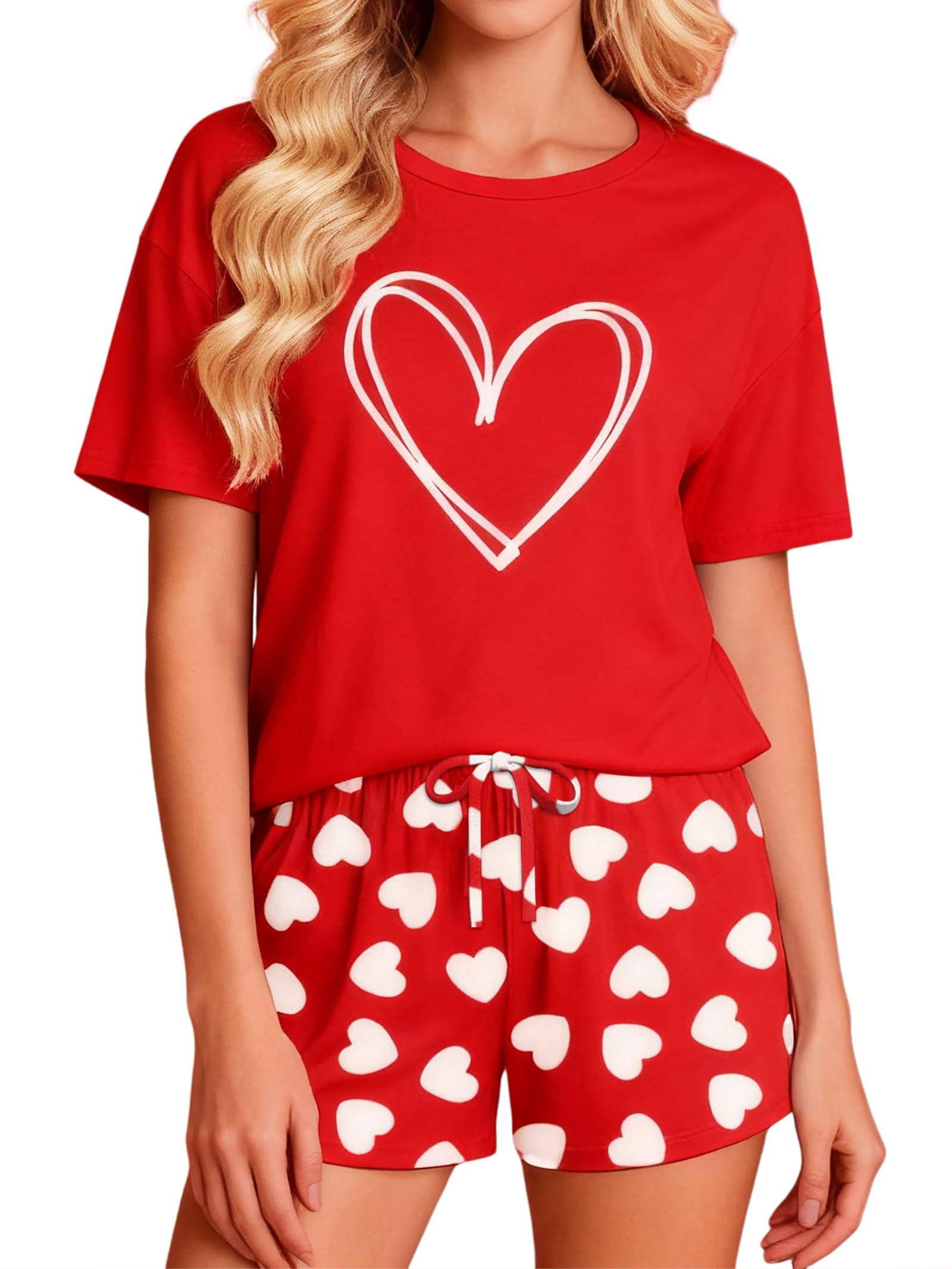 Valentine pajamas:This adorable valentines day shirt pajama set features a red/pink short-sleeve top with heart graphic and matching shorts with heart prints. A cute, romantic choice for valentine pajamas women to embrace the holiday vibe.