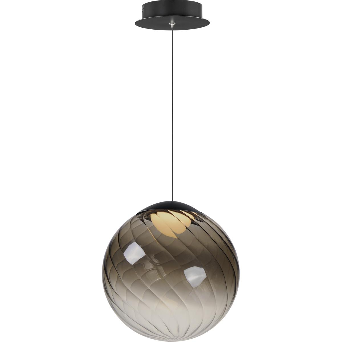 In a galaxy of light, ribbed and tinted glass is supported by swooping arcs of circular tubes. The Gold frame supports glass globe shades colored in Amber and Smoke tints that encase LED lamps provided. The single pendant has an over-sized spiraling glass shade in either Amber or Smoke, with a dome of light within and Matte Black components. Two configurations of wall sconces pair perfectly with the collection.
