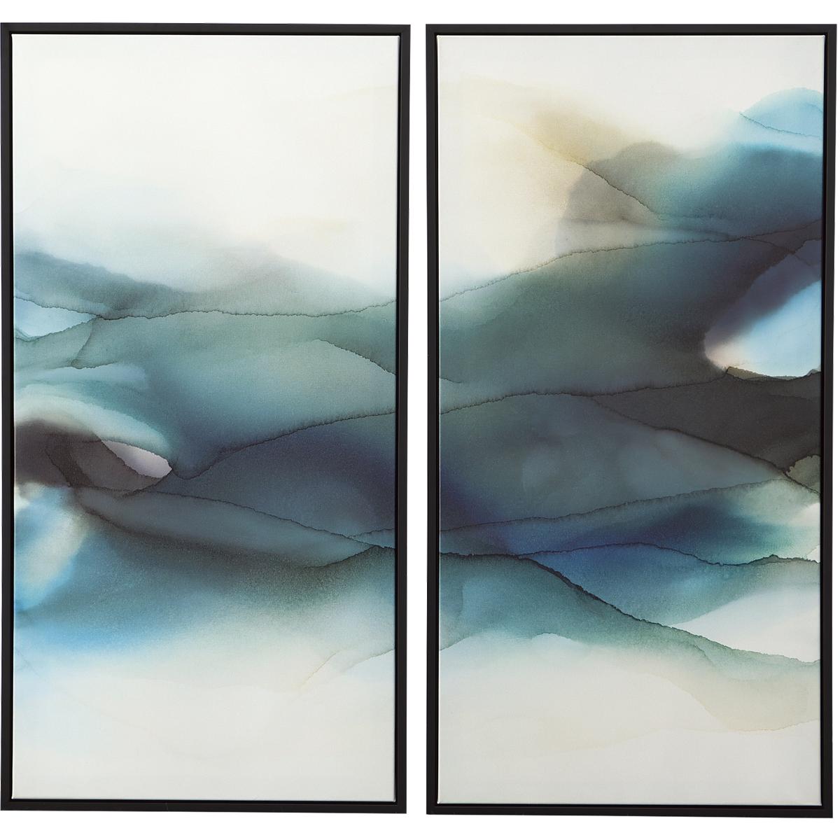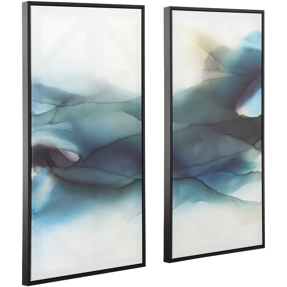 The september desert giclee on canvas exibits a modern watercolor of serene navy, teal, and beige tones. Accented by a solid wood gallery frame with black finish. May be hung horizontal or vertical. Each canvas is proudly handcrafted and printed in the usa. Artwork by kippi leonard.