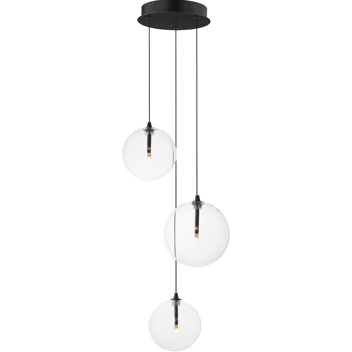 An airy configuration of Clear blown glass globe shades in various sizes suspend on thin low voltage wires. Thin tubes finished in Black or Gold descend into the center of the globes where a small G4 LED lamp provides a spark of light.