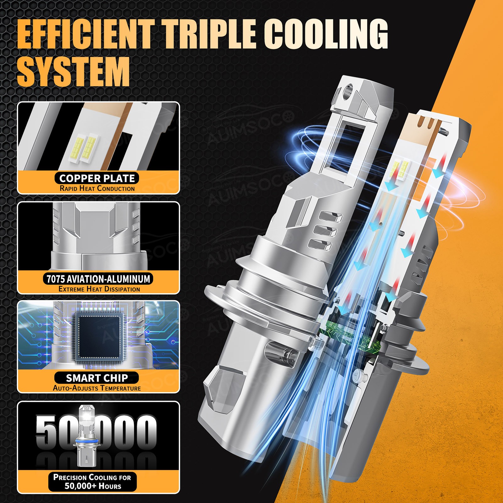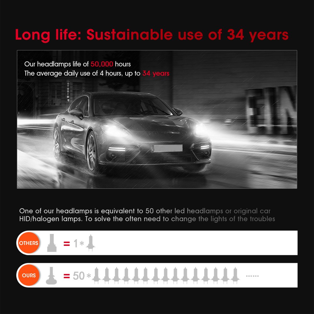 The led bulb with the all-aviation aluminum body, hydraulic fan and built-in intelligent IC and temperature control system can perfectly solve the problem of light decay and dead lamp caused by the highest temperature of LED car light to ensures it will last longer.