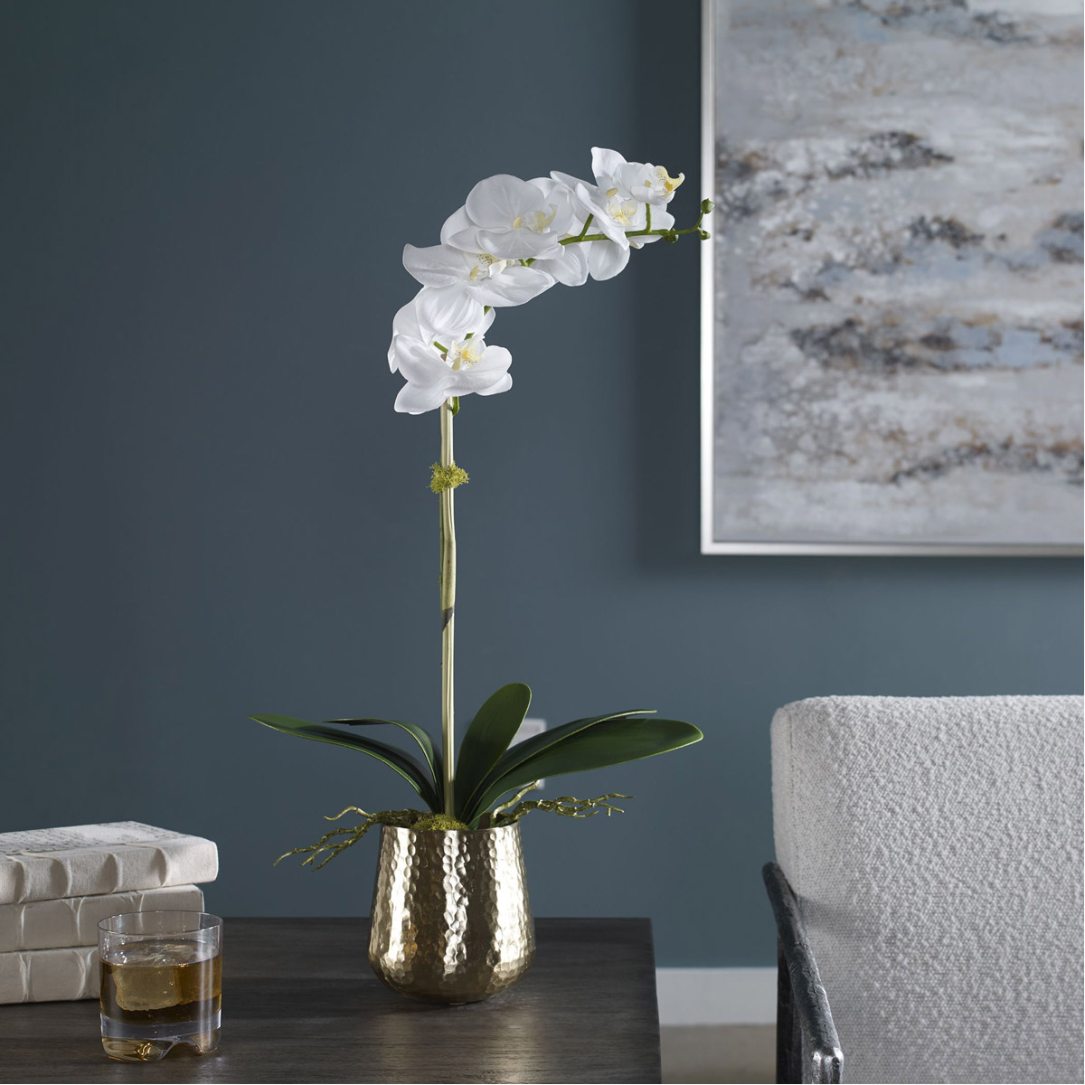 A Gracefully Arching Stem Of White Orchids With Reindeer Moss Accents Over A Bed Of Naturally Preserved Moss, Placed In A Contemporary Hammered Brass Metal Pot. Container Is 4.5" W X 4.5" H X 4.5" D.