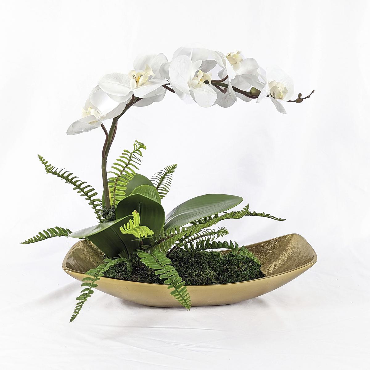A Graceful, Flowing White Orchid Seems To Float Over A Bed Of Naturally Preserved Moss In A Textured Cast Aluminum Antique Brass Boat.