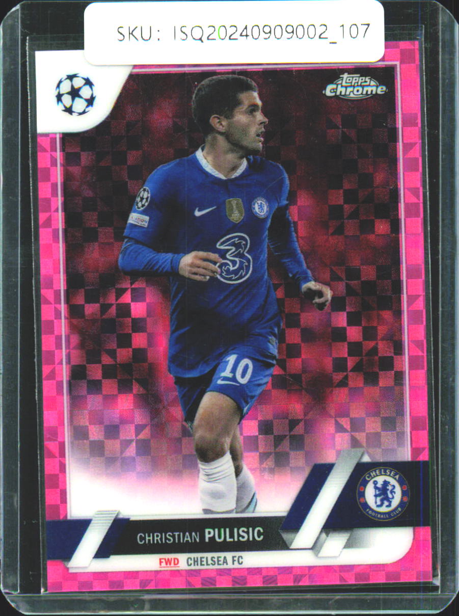 Up for sale is a stunning 2023 Topps Chrome Christian Pulisic card, numbered /250. This Pink X-Fractor #144 showcases the exceptional talent of the U.S. Men's National Team star. The vibrant pink refractor design enhances the visual appeal, making it a must-have for any collector or fan. The card is in excellent condition, carefully handled and stored to maintain its quality. Whether you're looking to add to your personal collection or searching for the perfect gift for a soccer enthusiast, this limited edition card is sure to impress. Don’t miss your chance to own a piece of soccer history featuring one of the game’s brightest stars!