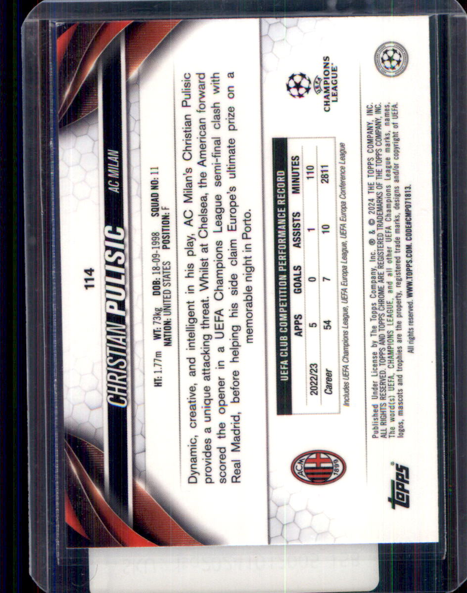 Elevate your collection with this 2023 Topps Living UEFA Club Competitions Christian Pulisic card, numbered /225. This stunning base card features the talented U.S. soccer star, showcasing his dynamic playstyle and skill on the field. The vibrant design captures the essence of the UEFA competitions, making it a must-have for any soccer enthusiast or collector. Whether you're looking to enhance your personal collection or add a special piece to your investment portfolio, this limited edition card offers both rarity and appeal. Don't miss out on the chance to own a piece of soccer history! Secure it now and celebrate the journey of Christian Pulisic in club competitions.