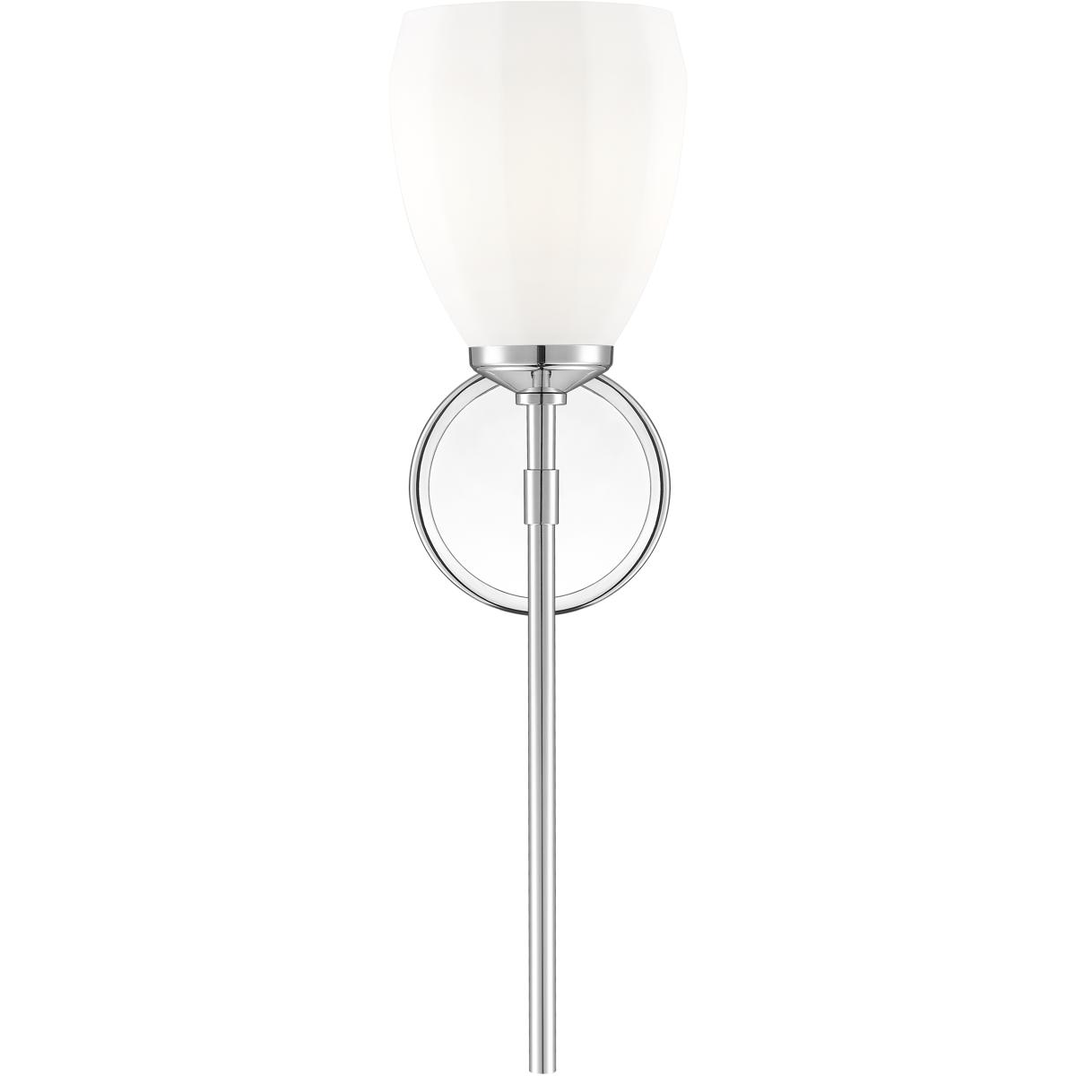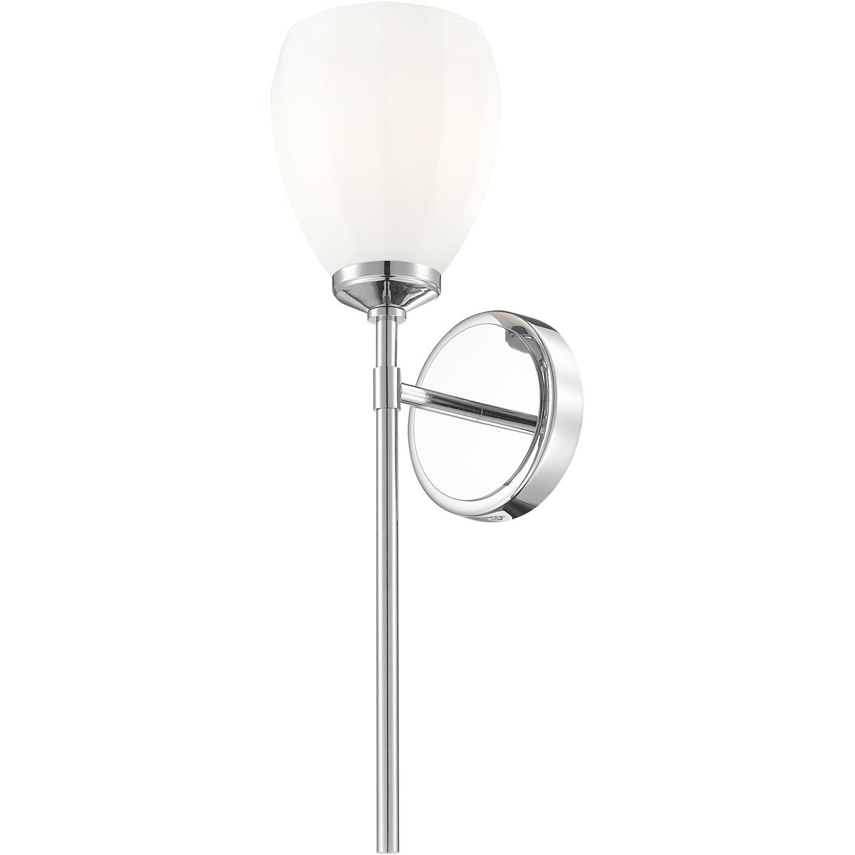 Gleaming chrome reinforces the modern allure of a one-light wall sconce that's perfect for powder room or bath. Its floral silhouette is enhanced with a slim stem and intriguingly delicate matte opal glass that casts bright uplighting perfect for both ambiance and tasks.