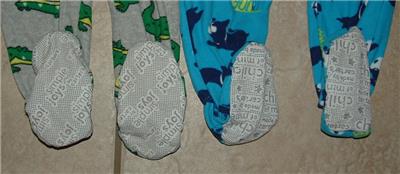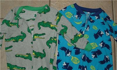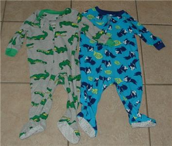 These sleepers are size 12M and very gently worn, in great condition, no rips or stains, might have some wrinkling with shipping. Both are made with 100% polyester and machine washable. The gray one is made by Simple Joys by Carter's, the blue one is made by Child of Mine by Carter's. Cute and comfy sleepers.