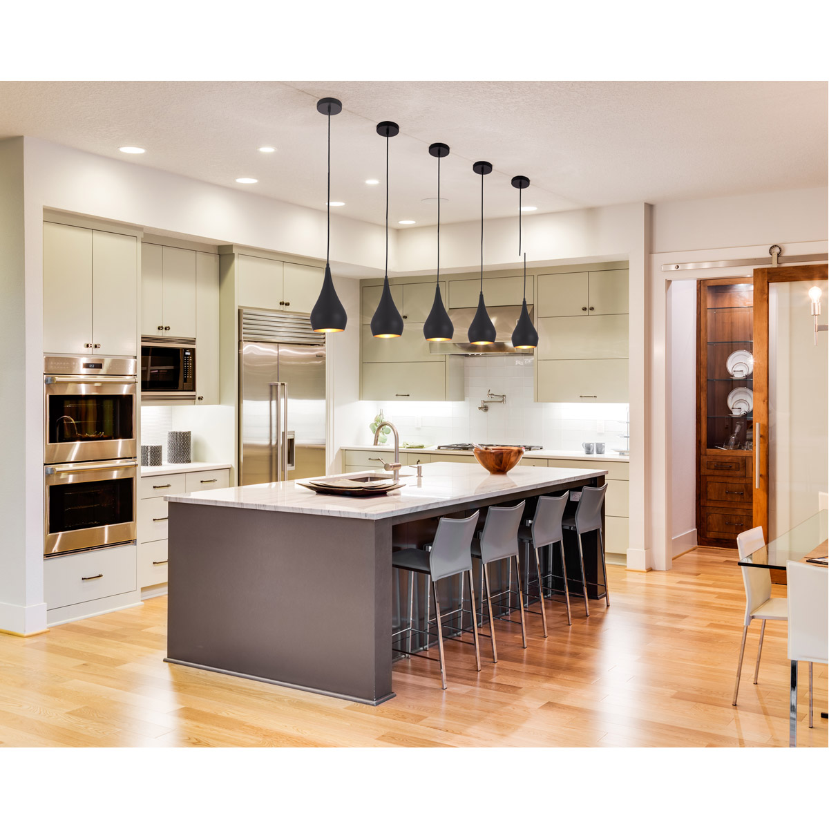 Set the right mood in a kitchen, office, or bedroom with Nora collection hanging lights. Sleek teardrop shaped or larger chalice-shaped aluminum shades come in a smooth white or sexy matte-black finish; larger lamps feature a wood detail. Contrasting vintage brass finish on the inside of the shade gives these pendant lamps just the right amount of attitude.