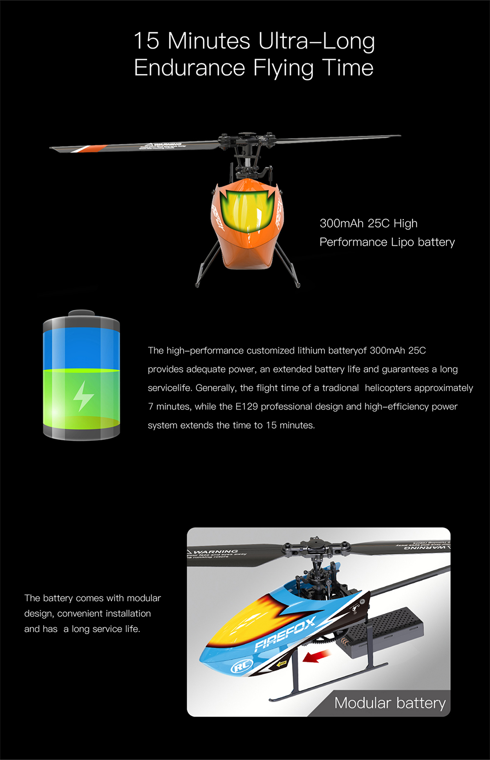 4. The high-performance customized 300mAh 25C lithium battery,flight time to 15 minutes.