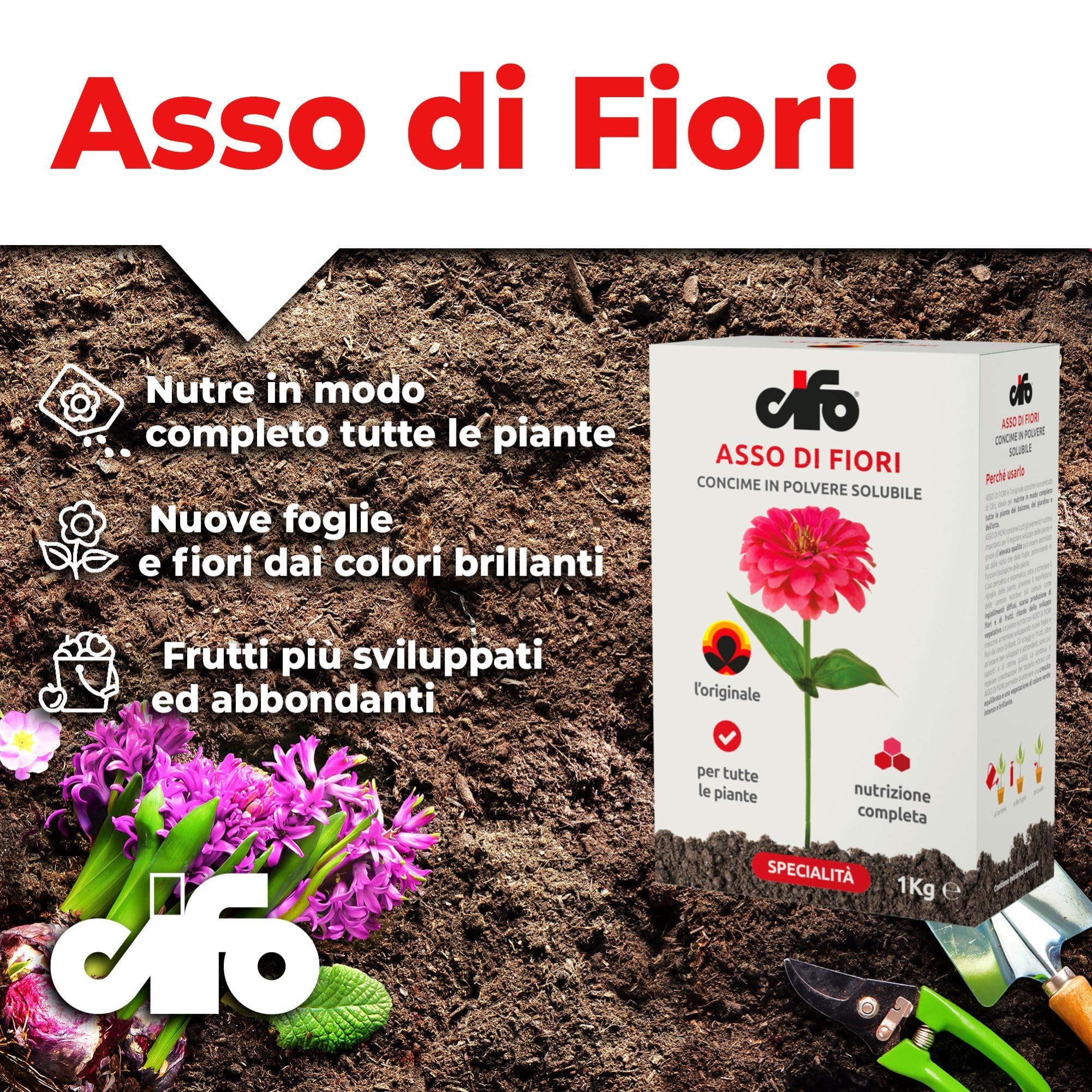 Cifo Asso di Fiori è un concime concentrato in polvere ideale per alimentare tutte le piante del balcone, giardino e orto, fornendo un apporto nutrizionale completo che favorisce la crescita sana e vigorosa delle piante, con particolare attenzione al loro sviluppo ottimale. Questo concime aiuta a prevenire problematiche comuni come l'ingiallimento delle foglie, la scarsa produzione di fiori e frutti e il rallentamento dello sviluppo vegetativo, migliorando la salute generale delle piante e promuovendo una vegetazione abbondante. Asso di Fiori può essere utilizzato in qualsiasi fase della vita della pianta, adattandosi a diverse modalità di applicazione, come l’irrigazione al terreno, la nebulizzazione sulle foglie o la distribuzione diretta sul terriccio, garantendo un uso versatile e pratico. Disponibile in confezioni da 1 kg, il concime è dotato di un misurino dosatore che facilita il corretto dosaggio. Per l’irrigazione al terreno, sciogliere 9 g (un misurino) in 5 litri d’acqua per piante in vaso. Per nebulizzare le foglie, sciogliere la stessa quantità in 2 litri d’acqua. In alternativa, per la distribuzione diretta al terreno, spargere 9 g sul terriccio bagnato per vasi di 20-25 cm di diametro. Fondata a Bologna, Cifo è leader nella produzione di concimi e formulati per giardinaggio e agricoltura. Con oltre 50 anni di esperienza, ci distinguiamo Con i suoi 60 anni di esperienza, si distingue per la qualità dei suoi prodotti, supportati da un'intensa attività di ricerca e da impianti produttivi all'avanguardia