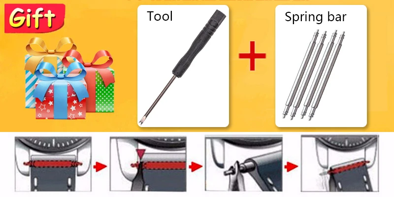 Package: 1pcs watch bands ,4pcs spring bars and a small tool