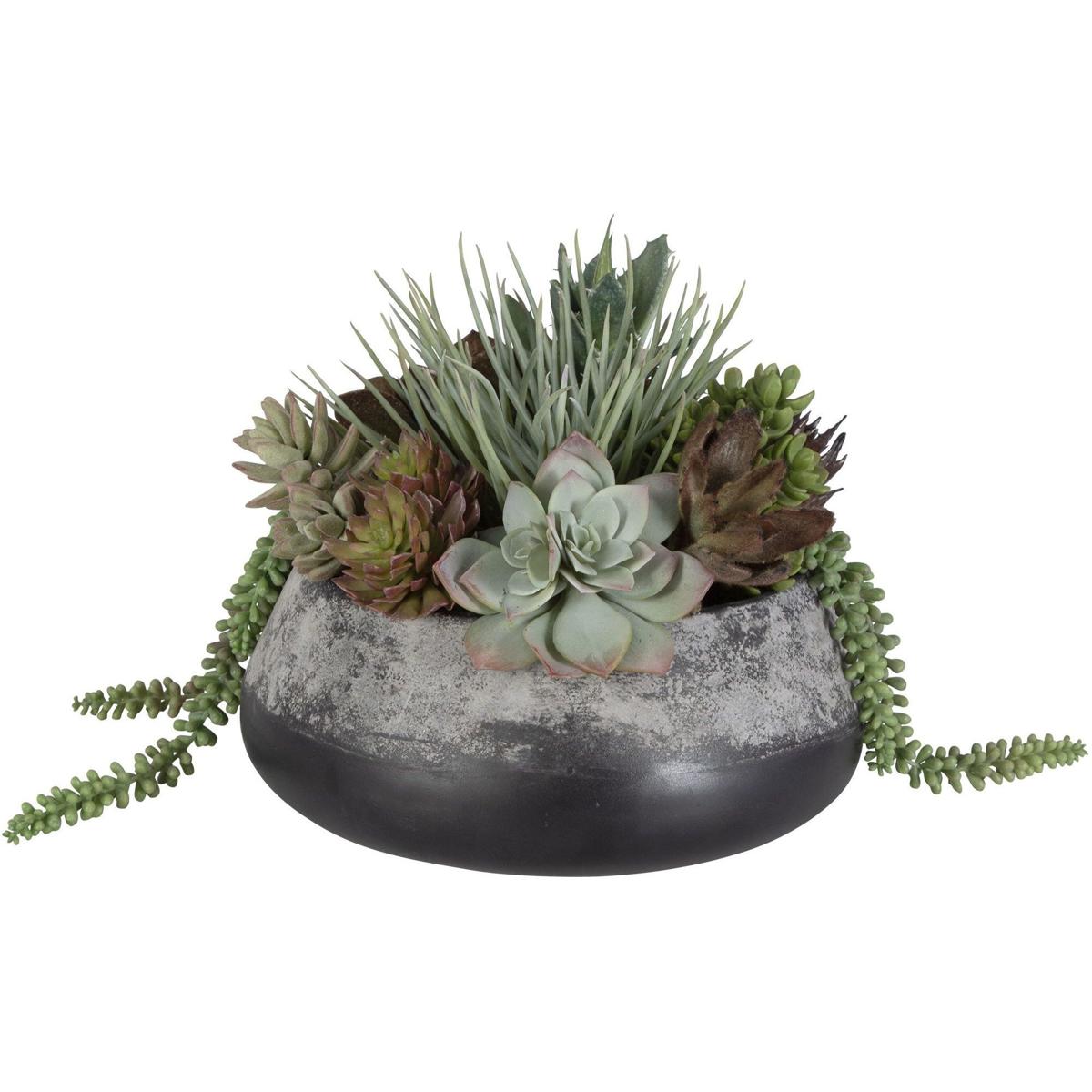 A Stunning Centerpiece Full Of Life-life Succulents And Sedum Varities. Deep Tones Of Green And Burgundy Add To Its Richness, Complementing The Dark Iron Planter With Antiqued Edge Accents.