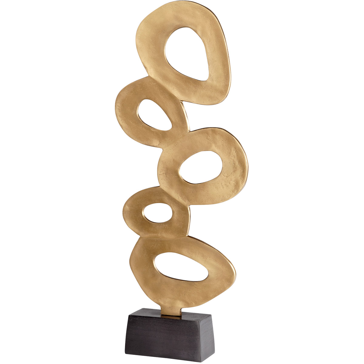 This gilded floor standing sculpture consists of several cascading concentric forms, of varying scales, that are conjoined with each other. The Chellean Lux #2 sculpture is supported by a modest dark monochrome base. This abstract floor sculpture is best suited for any residential or commercial space.
