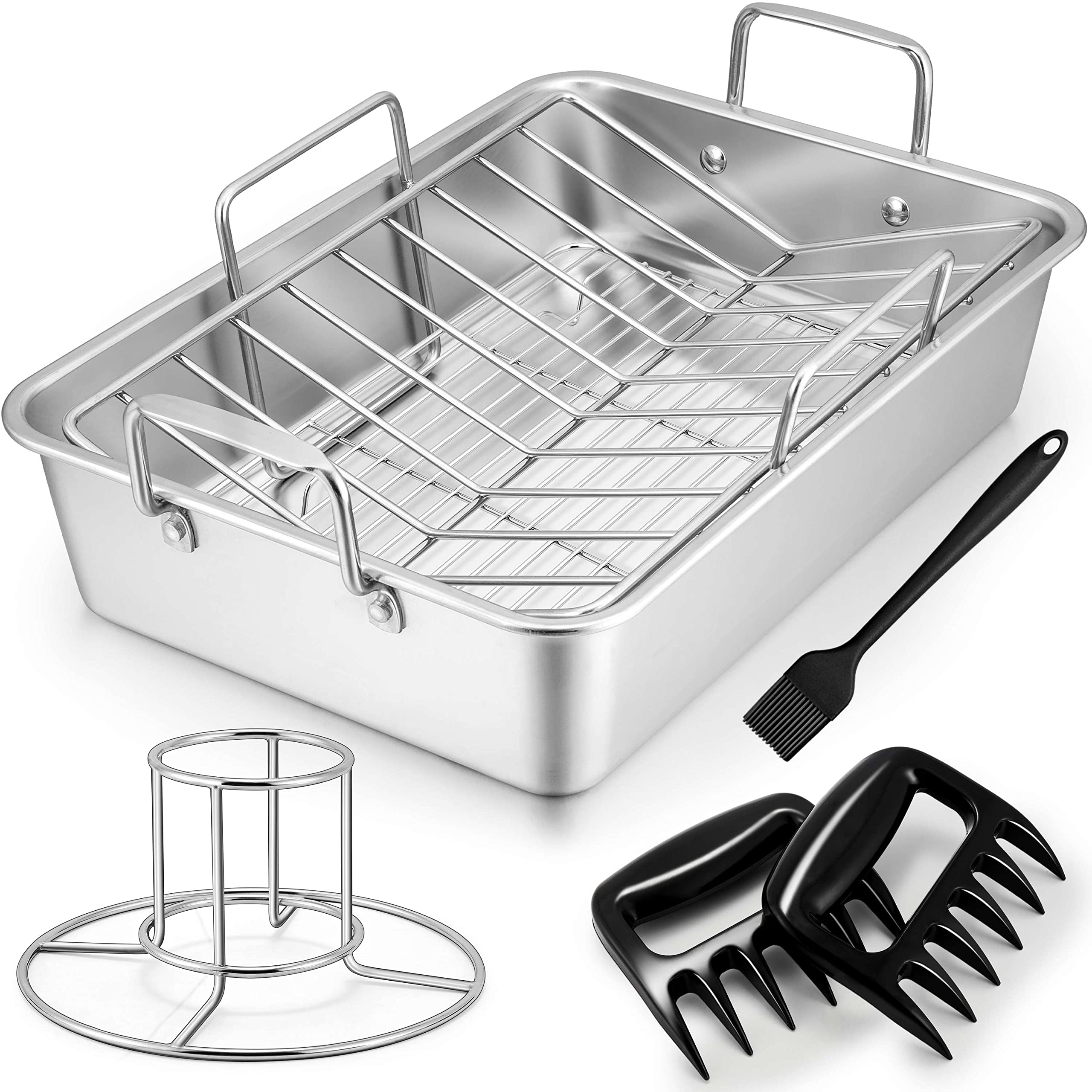 EXQUISITE CRAFT - Large roasting pan features heavy duty and solid construction, Sturdy for long-last serving time, Wider and vertical handles firmly riveted to the pan, Effortlessly remove the pan from oven, Tall v rack with thick and sturdy design, Not easy to deform, Keeps the meat up from the juice and leaves more room to add veggies, The sharp edges of meat claws that strongly grips the meat and tears it apart easily