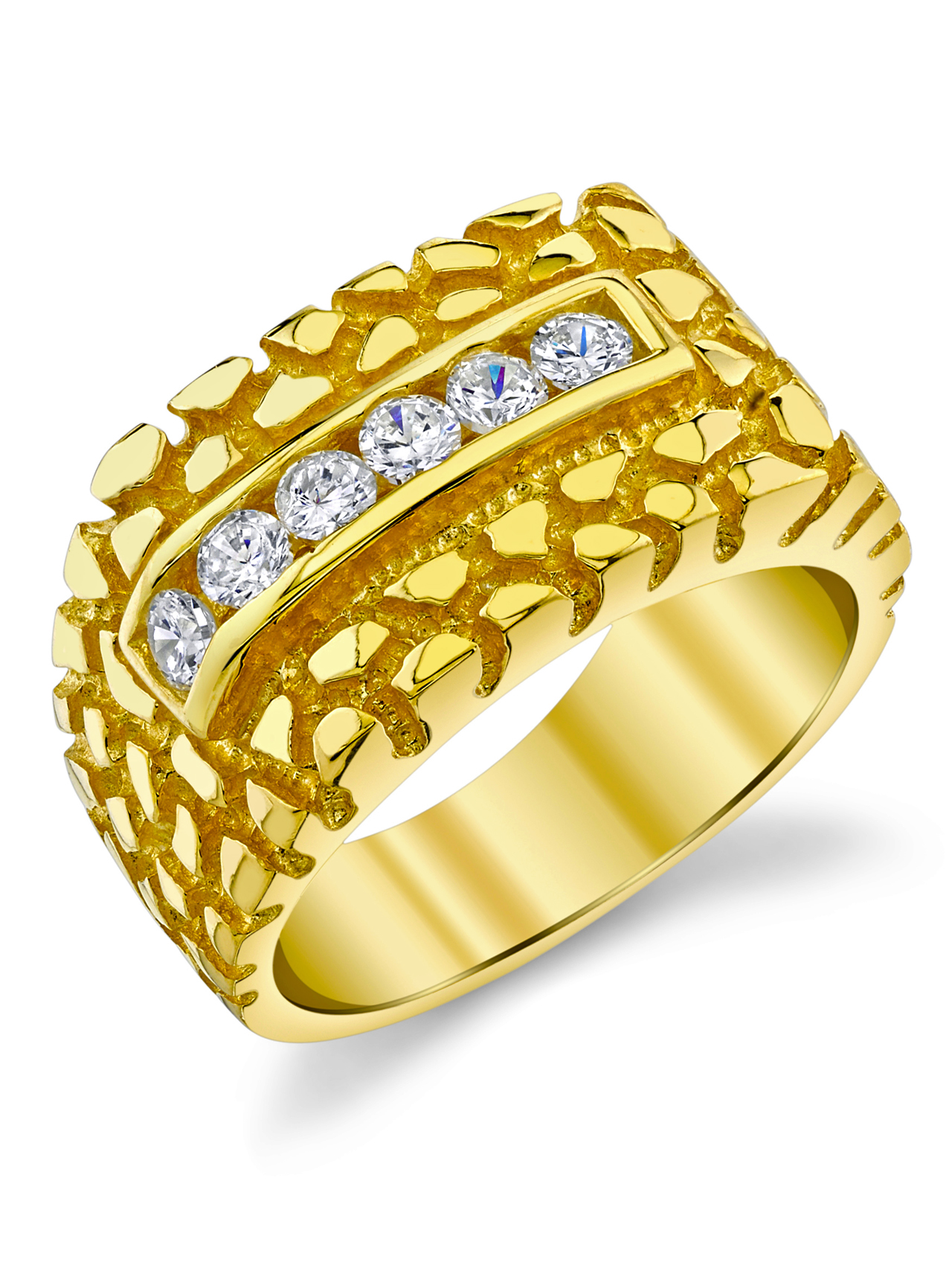 Catch all the looks with this distinctively fashionable goldtone ring for men. Constructed with fine Sterling Silver 925 and featuring a row of round-cut brilliant cubic zirconia for extra shine encrusted in a textured and intricate nugget design makes this men'ss engagement ring or wedding band the right choice for those with a taste for stylish jewelry.