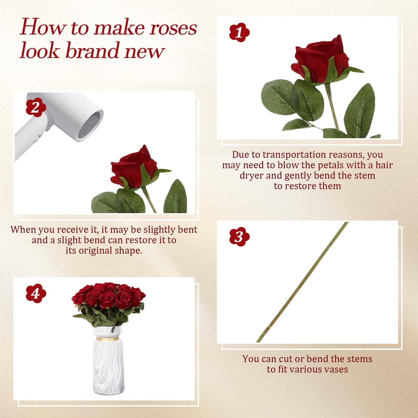 La fragranza Dura per Sempre:Fiori artificiali sono un accessorio straordinario che chiunque può utilizzare per portare un po' di verde e vita nella propria casa, e i vantaggi dei fiori artificiali significano che non solo sembrano e sembrano veri, ma sono disponibili tutto l'anno, le nostre rose realistiche appariranno fresche tutto l'anno, indipendentemente dalla stagione, dal caldo o da dove le posizioni.