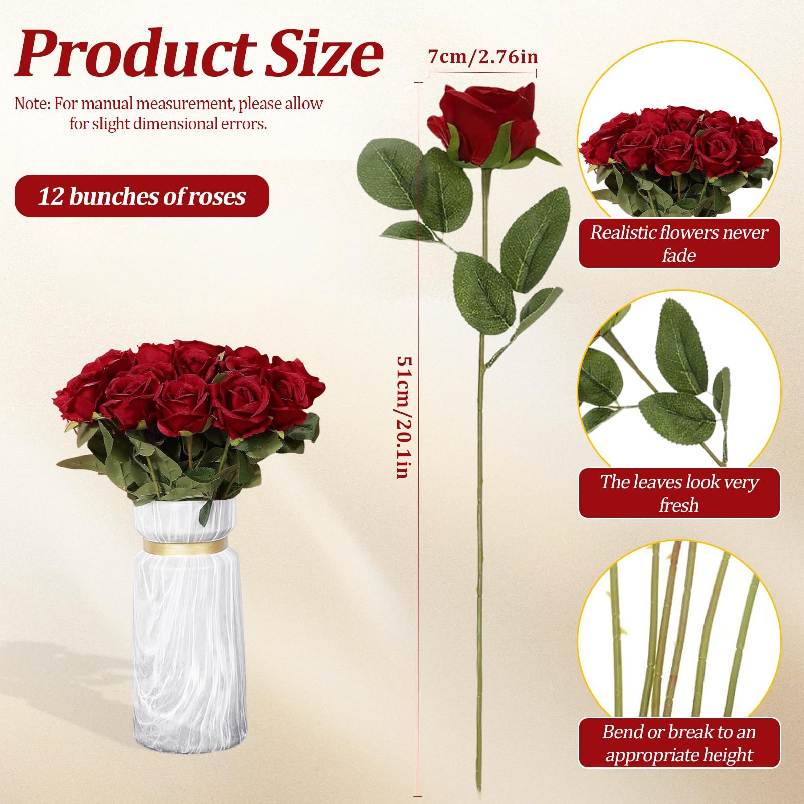 12 Pz Rose Finte in Seta Artificiale Bouquet 52cm Fiori Finti di Rosa con Steli