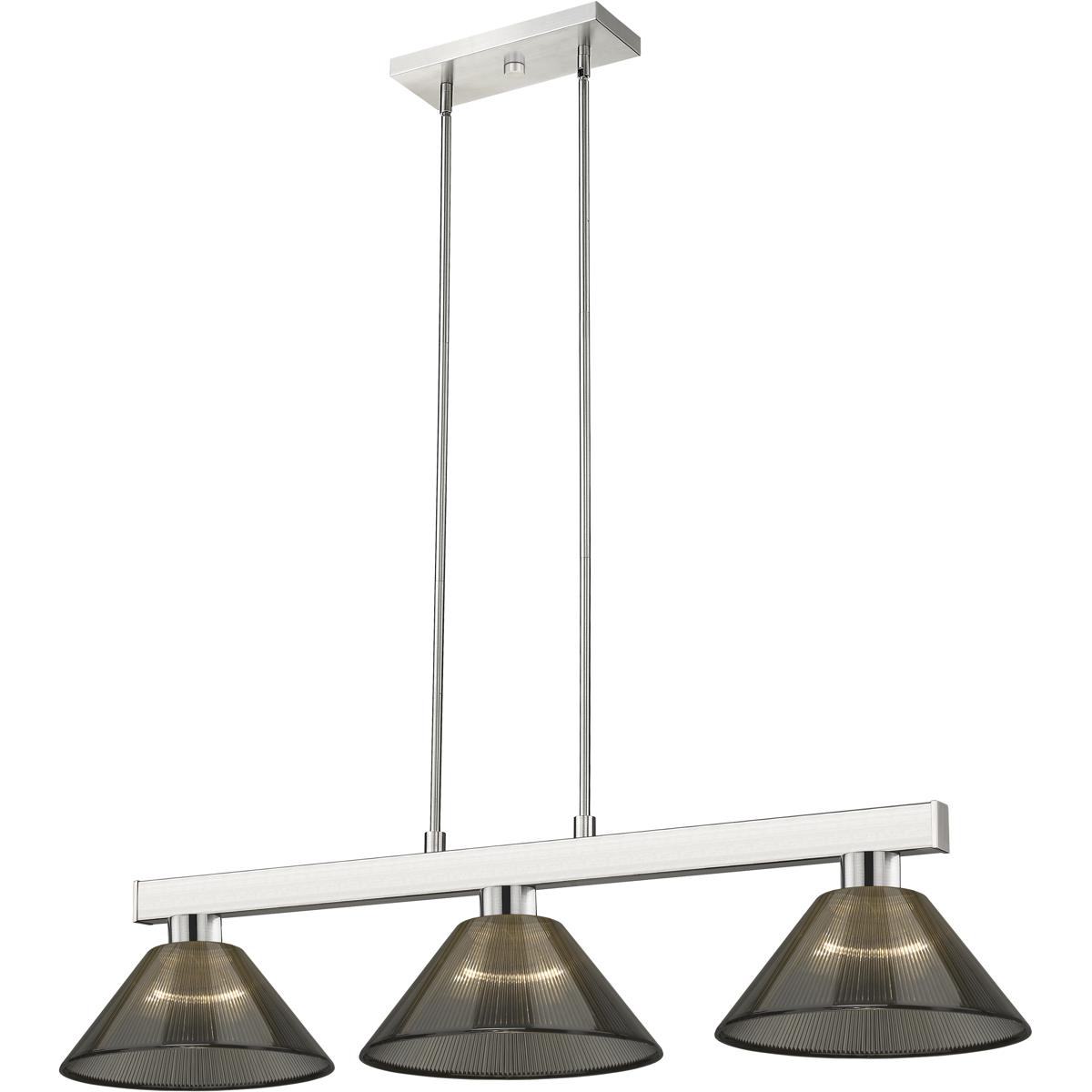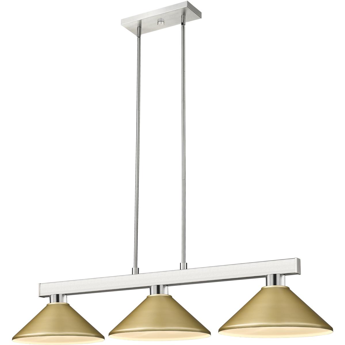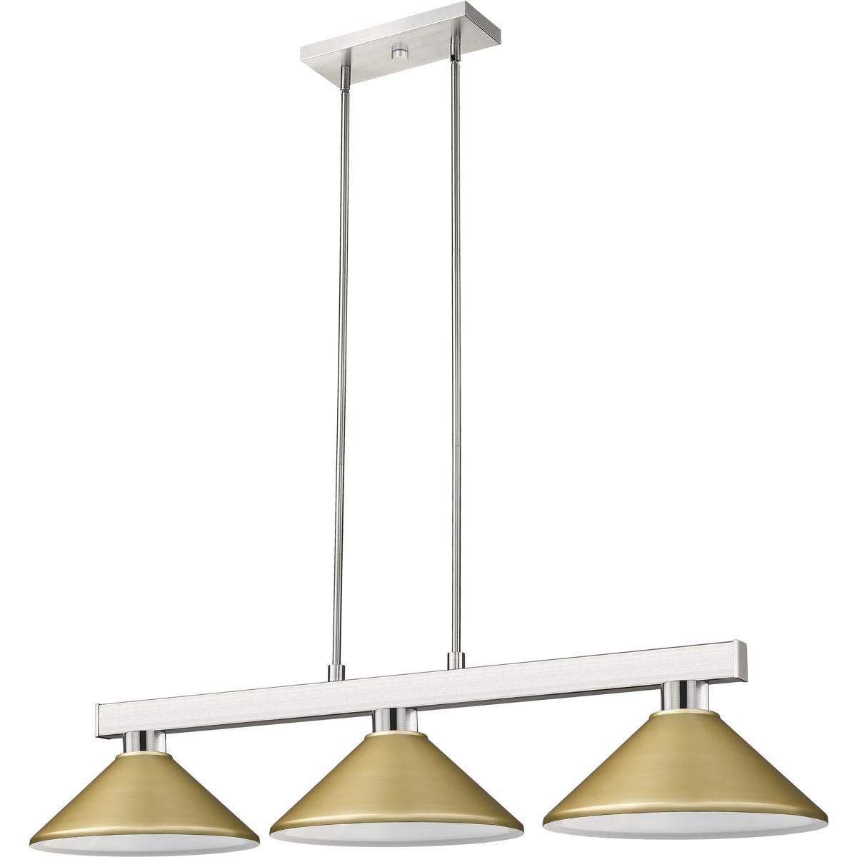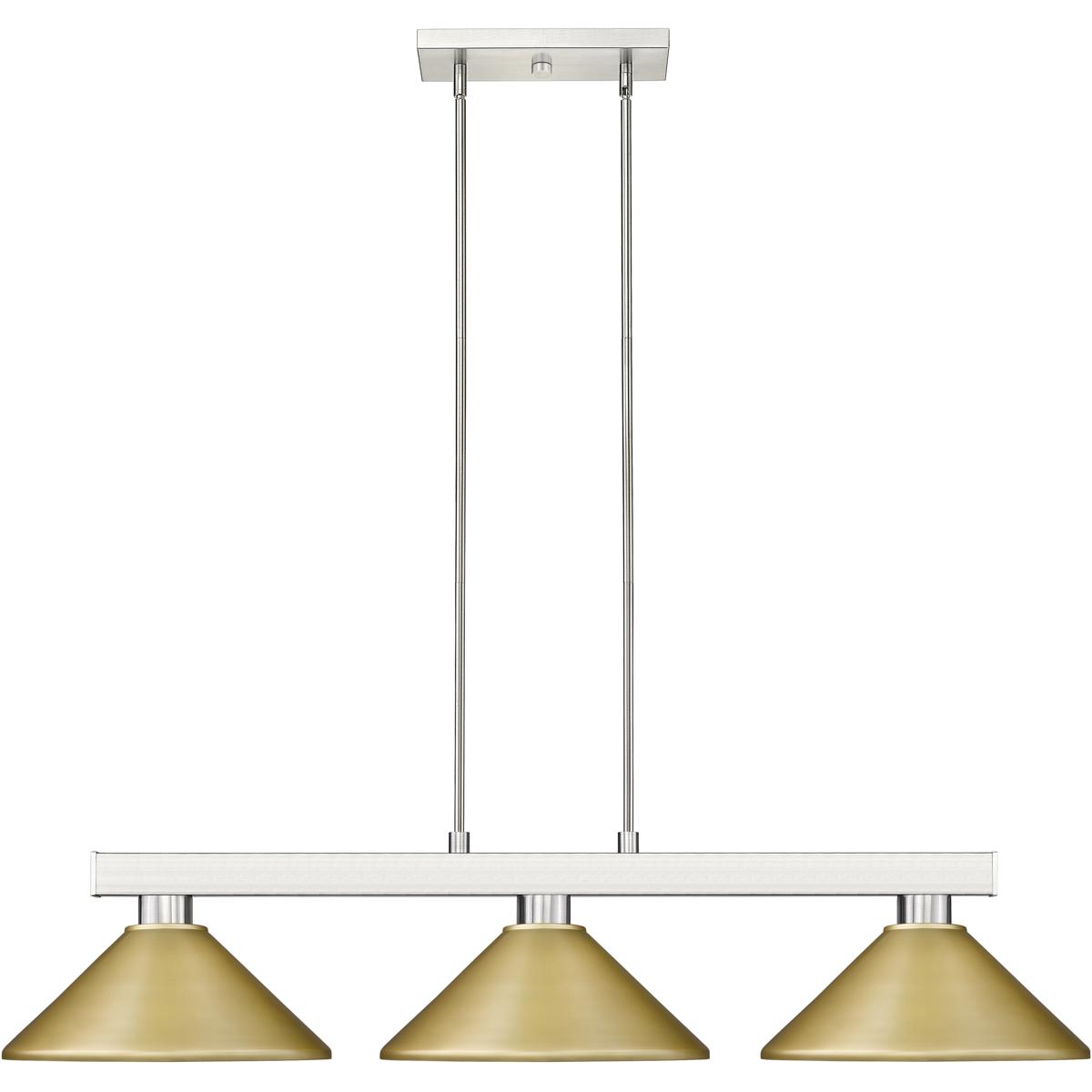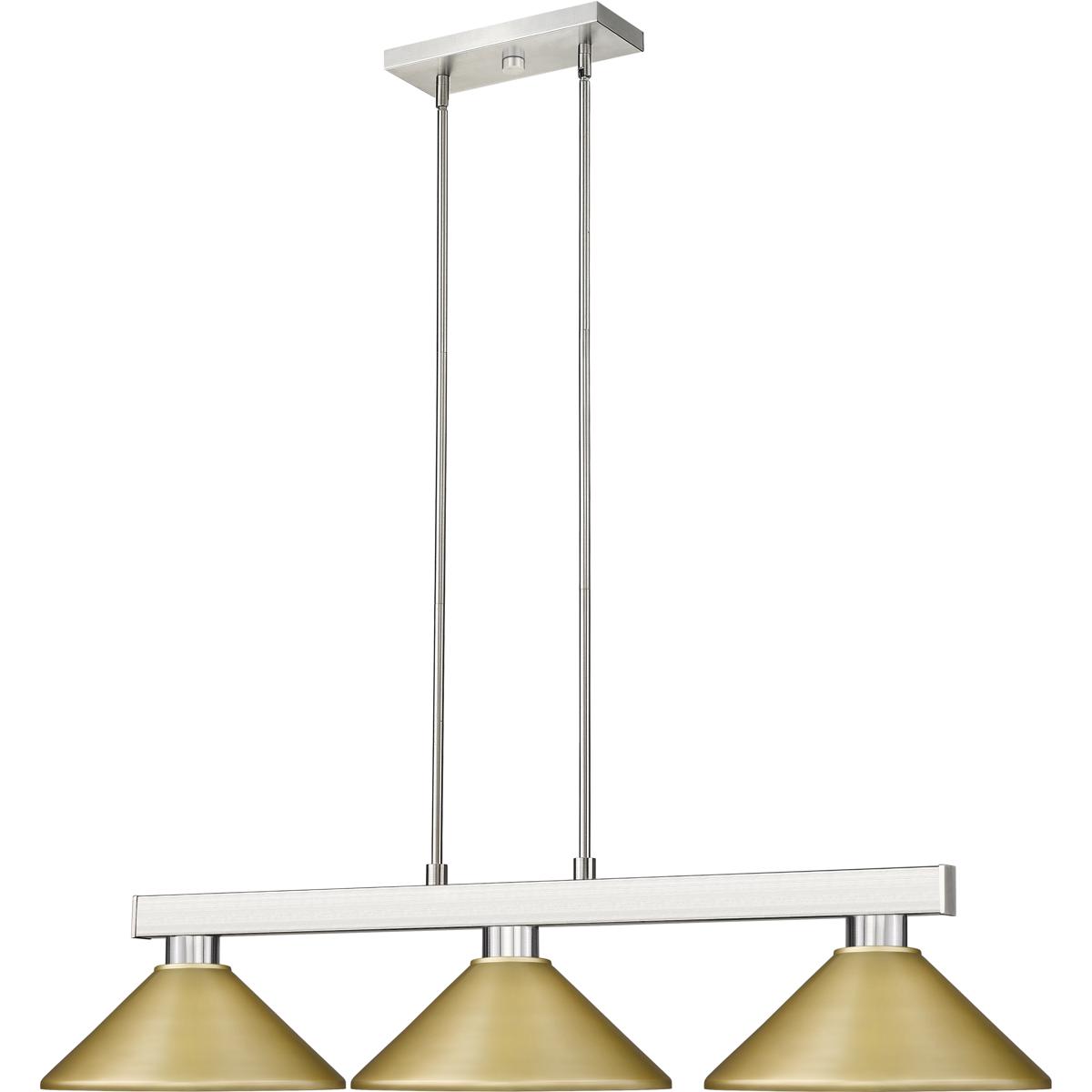 Straight line inspired detailing defines this beautiful three light fixture. Finished in brushed nickel and paired with metal satin gold shades, this three light fixture would be equally at home in the game room, or anywhere else in the house needing a touch of modern charm. Adjustable rods are included to ensure the perfect hanging height.