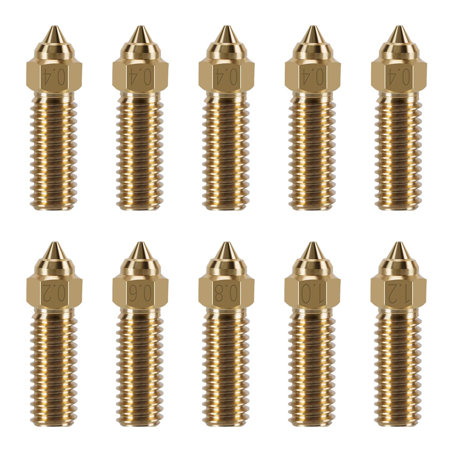 10PCS 3D Printer Extruder Nozzles Kit For K1/K1 Max/Ender 3 V3 KE, Packed High Temperature and Wear Resistance 5PCS 0.4mm, 1PC 0.2mm, 1PC 0.6mm, 1PC 0.8mm, 1PC 1.0mm and 1PC 1.2mm Brass NozzlesFits for FDM 3d printers:Creality K1Creality K1 MaxCreality Ender 3 V3 KEIncludes:5pcs 0.4mm brass nozzles1pc 0.2mm brass nozzle1pc 0.6mm brass nozzle1pc 0.8mm brass nozzle1pc 1.0mm brass nozzle1pc 1.2mm brass nozzleNote: Small parts, please keep it away from children to prevent the risk of swallowing!