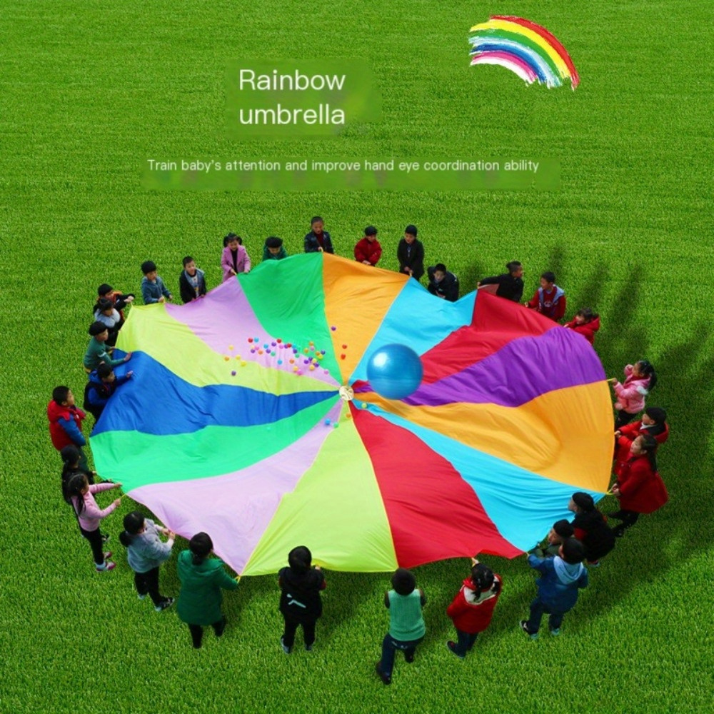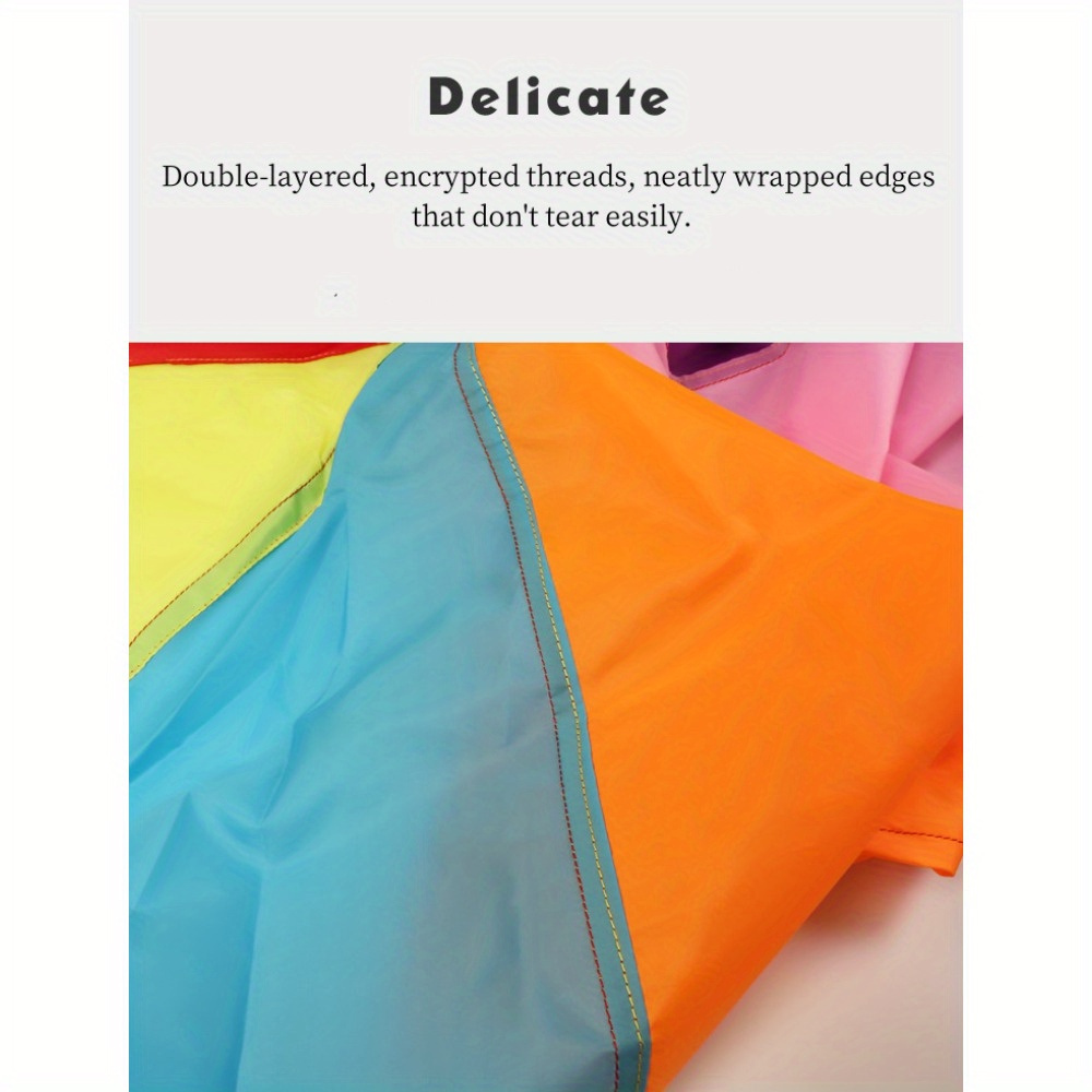 Characteristics: Our parachute can be easily folded, making it convenient for transport and storage. The parachute toys are crafted from durable materials that can withstand heat, featuring reinforced fabric joints that are resistant to tearing, and are designed in vibrant rainbow colors to catch the eye. These parachute toys aid in cognitive development, foster teamwork, and enhance physical strength and power as children grow.