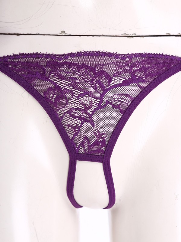 Front with see-through lace design, open butt and minimal coverage.