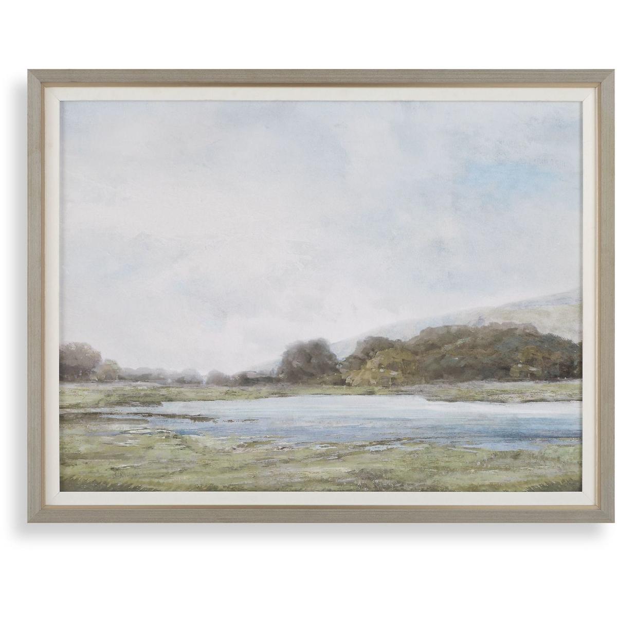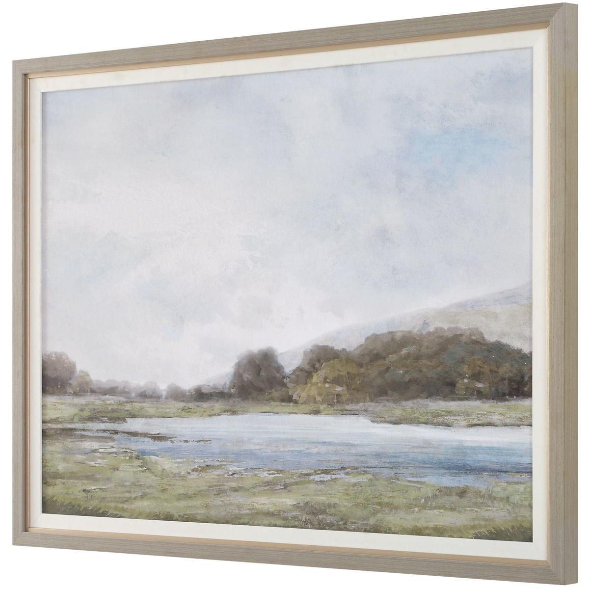 Find Tranquility In This Serene Framed Print. A Simple Yet Captivating Waterscape Features A Muted Palette Of Green And Blue Hues. This Minimalist Artwork Is Perfect For Creating A Peaceful Atmosphere In Any Space. A Gray Washed Wooden Frame With A Gold Liner And White Linen Mat Completes The Artwork.