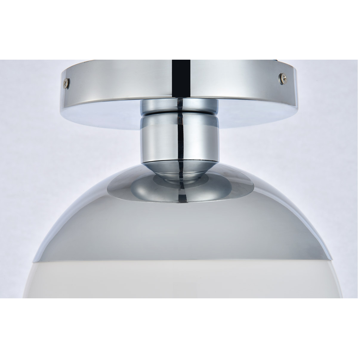 Refined style with a practical design, Eclipse flush mount bring cosmopolitan sophistication anywhere, especially to an entryway, office, bathroom, bedroom, or kitchen. The smooth iron frame features a disk-shaped canopy and comes in a chrome finish. A touch of color on top of the frosted white spherical glass shade brings character to this classic style. Living in the big city has never been this easy.
