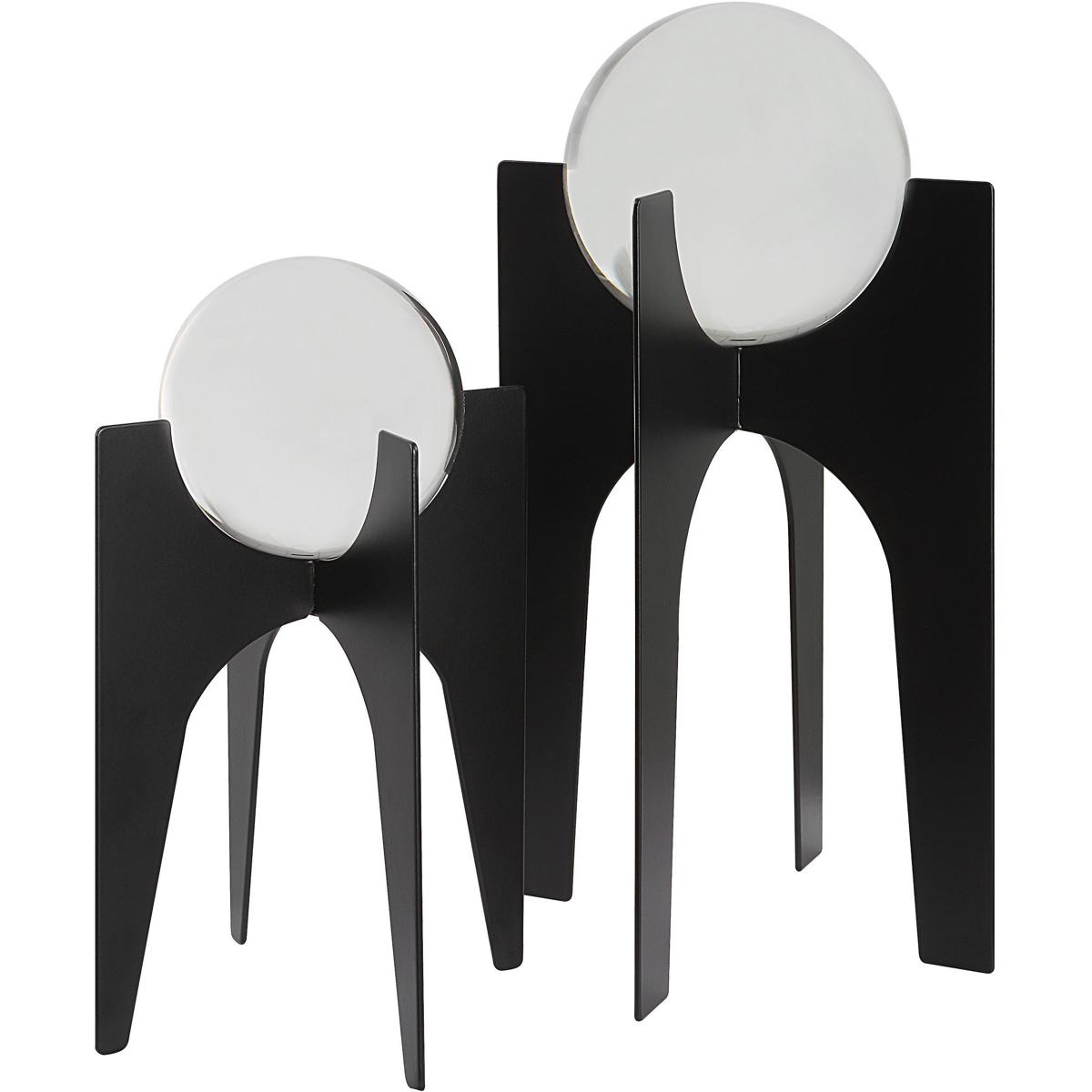 Crystal Spheres Elevated On Iron Bases Finished In A Brushed Black. Sizes: S-6x10x6, L-7x16x7
