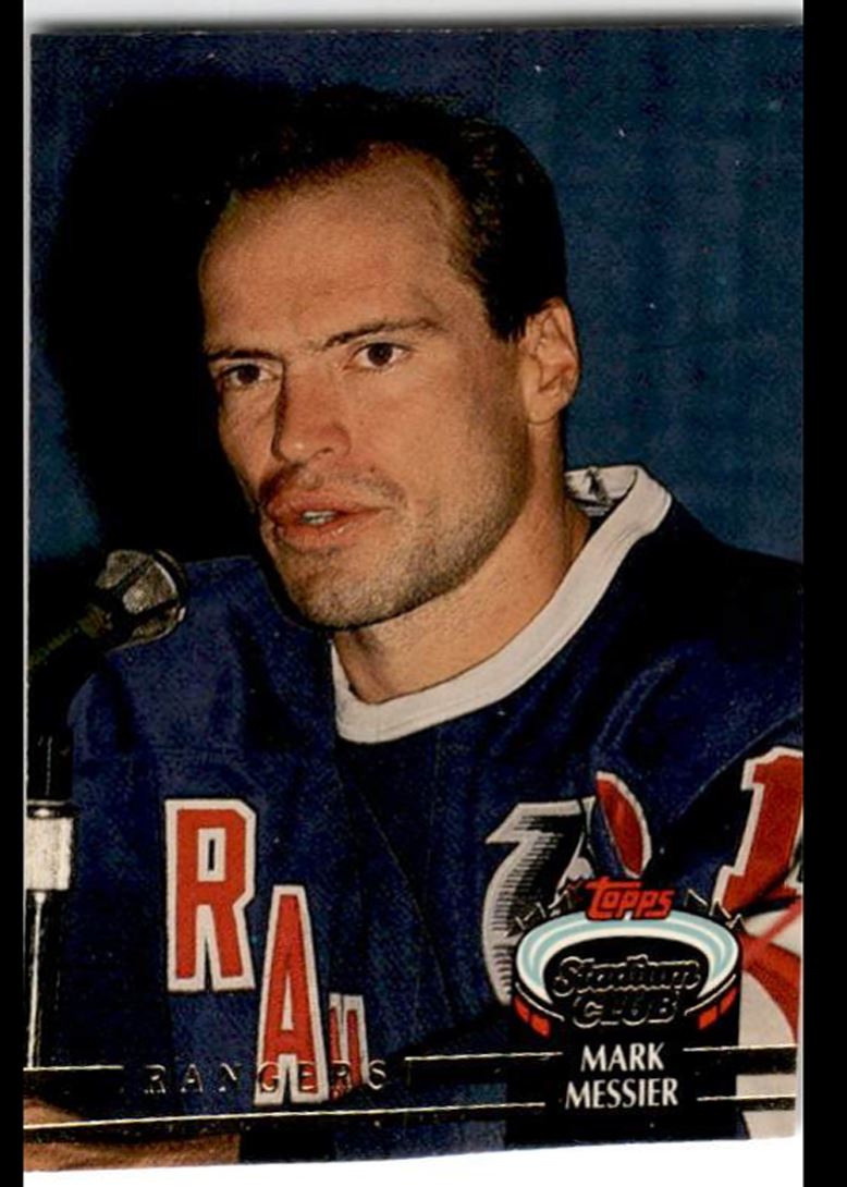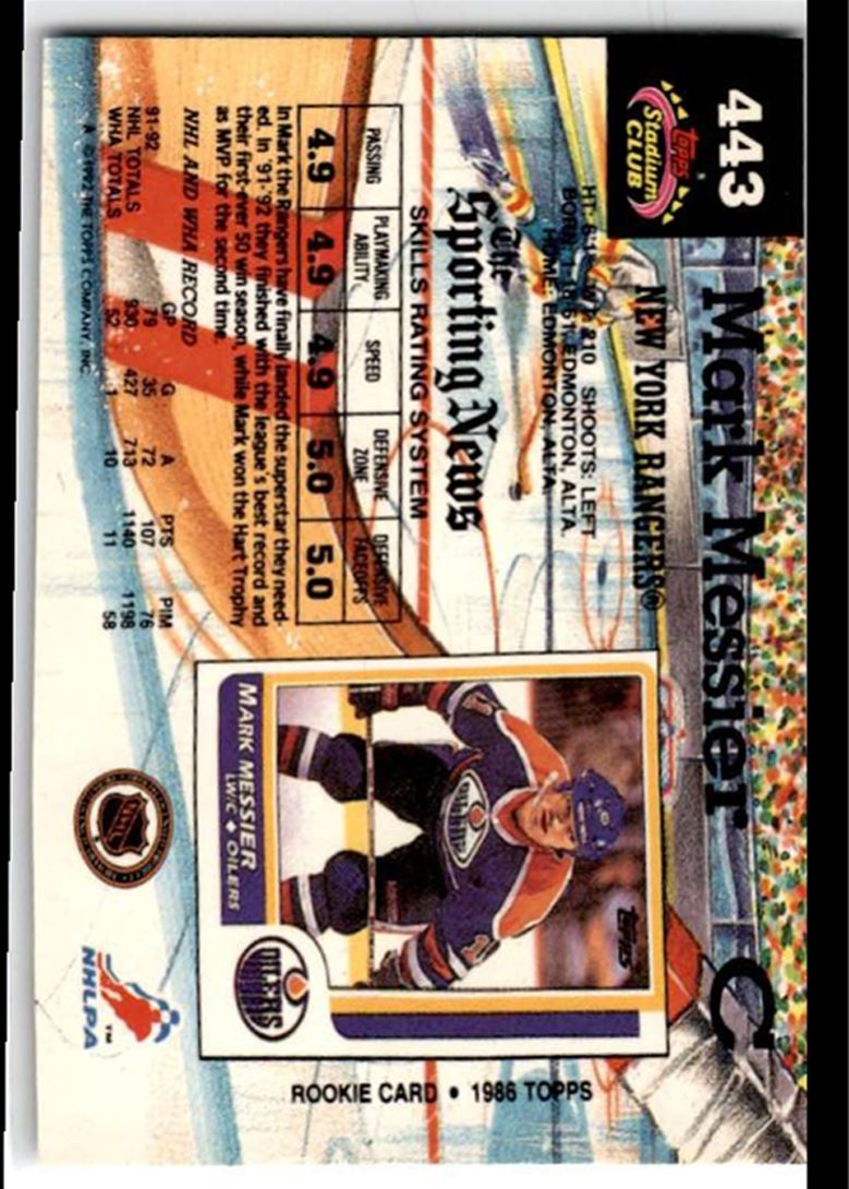 | Description: | Mark Messier | | Category: | Hockey | | Year: | 1992 | | Product: | Stadium Club | | Team: | New York Rangers | | Card Number: | 443 | | Dimensions: | 3½" x 2½" |