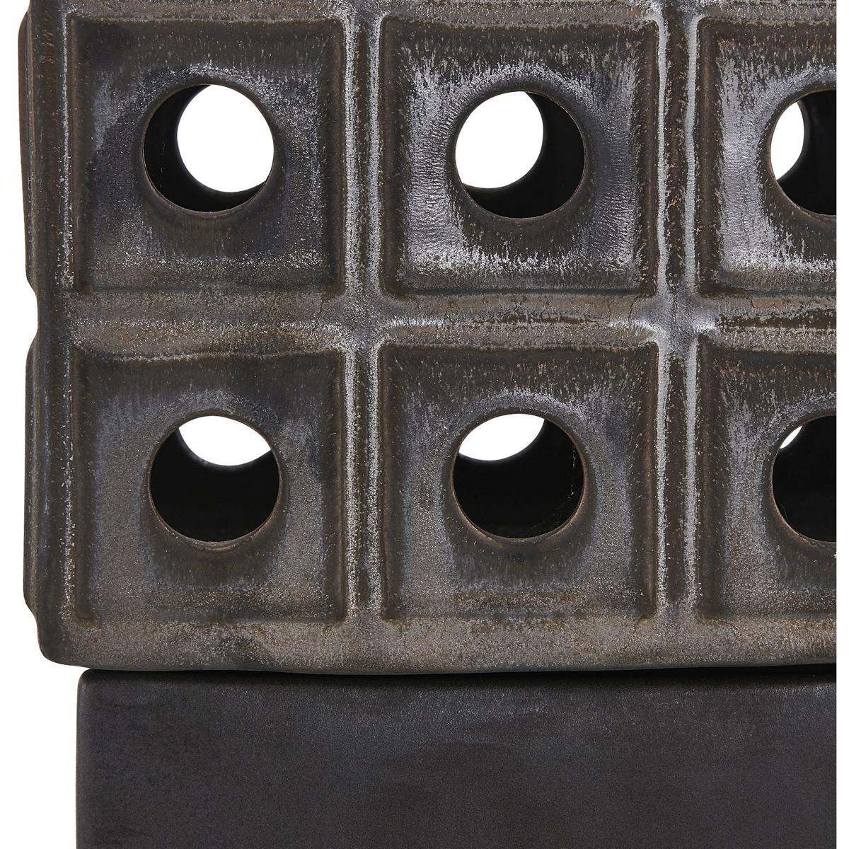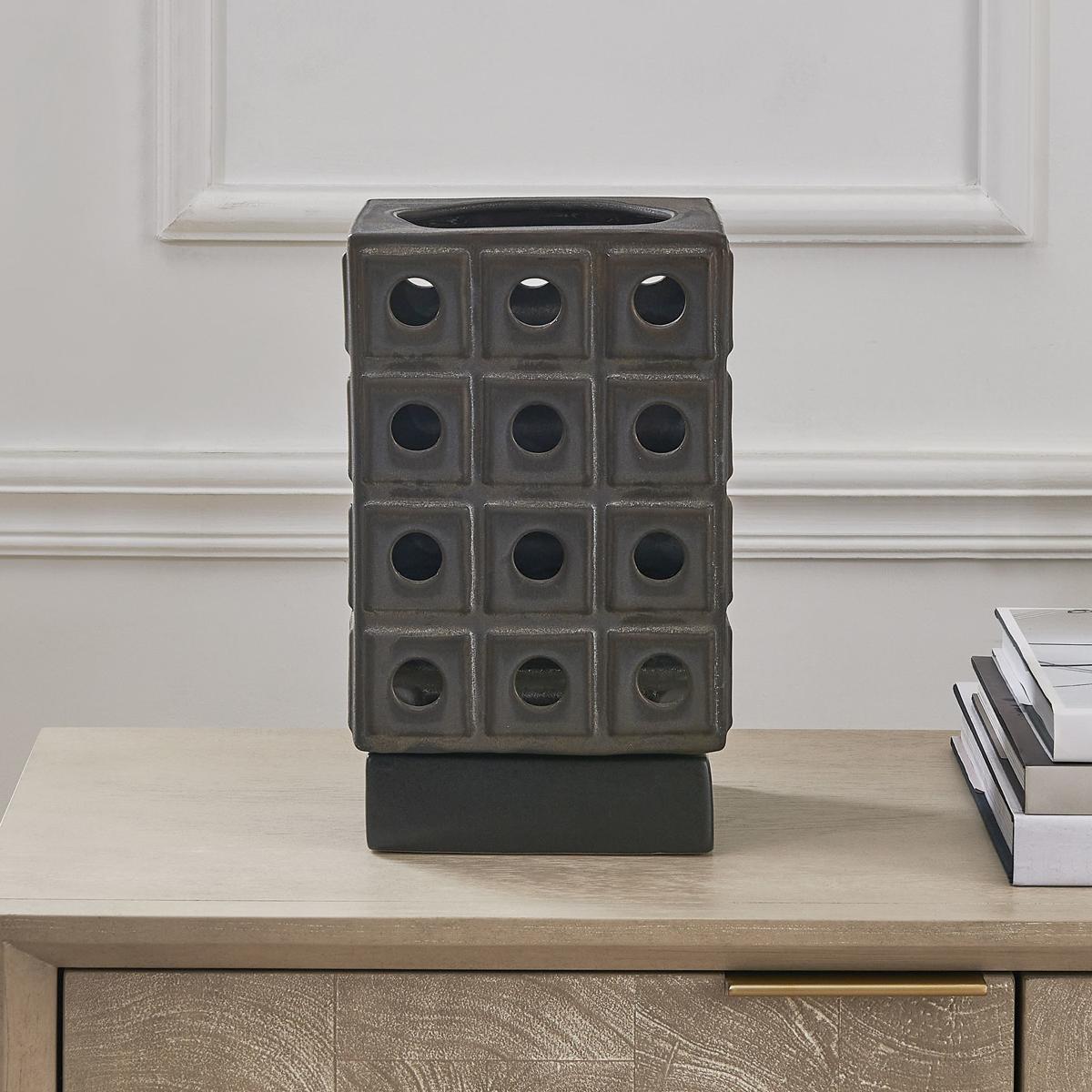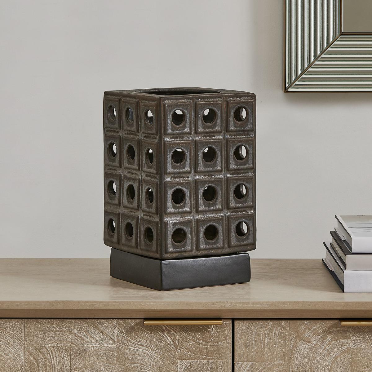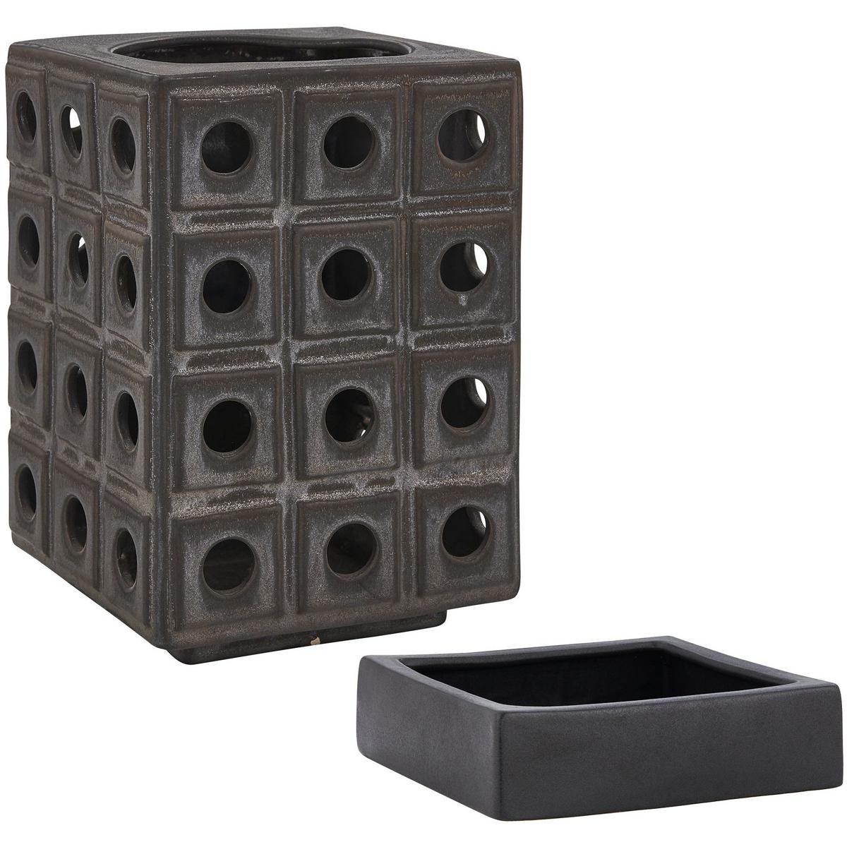 This Sculptural Earthenware Candle Holder Features A Unique Design With A Modern, Architectural Design, Finished With A Distressed Brown Glaze, Revealing Rich, Dark Bronze Undertones For Added Depth. Safe For Outdoor Use, But Protection From Freezing Temperatures Is Recommended.
