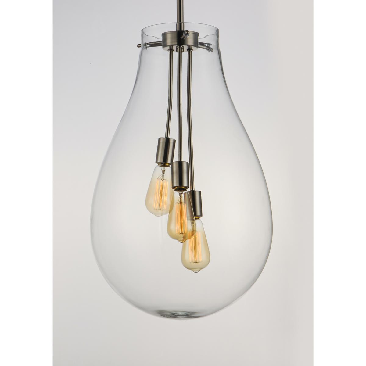 The crystal clear, large-scale glass pendants attest to the craft of hand-blown glass with their impressive scale. These hand crafted glass pendants embody simplicity and minimalism. Accented with Satin Nickel hardware, the style pairs well in a variety of settings.